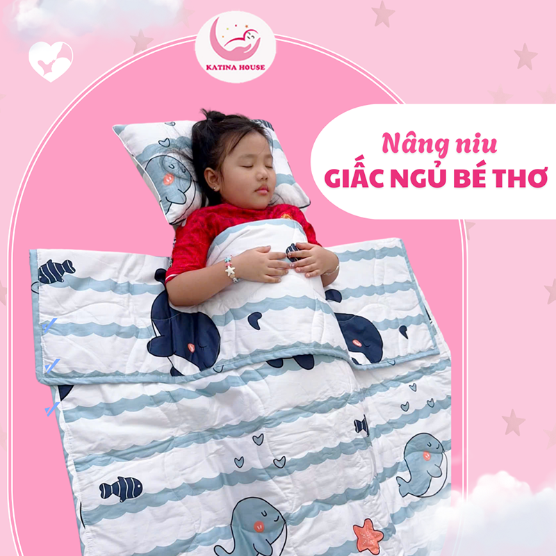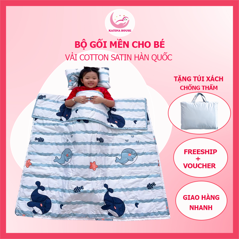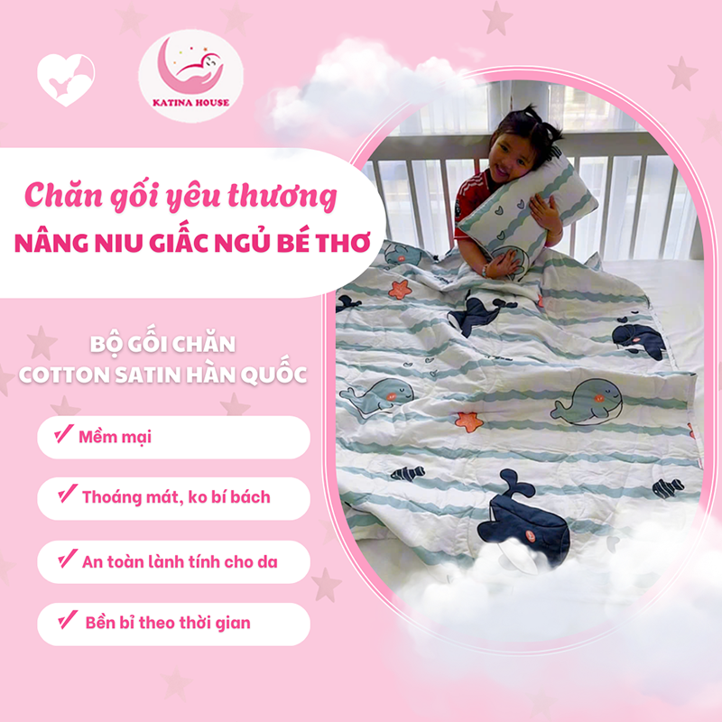 Bộ gối chăn cho bé Katina House, vải cotton satin hàn quốc đẹp, dày dặn, mềm mát, thấm hút tốt