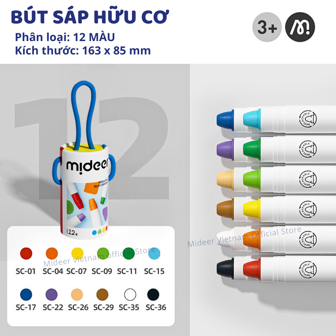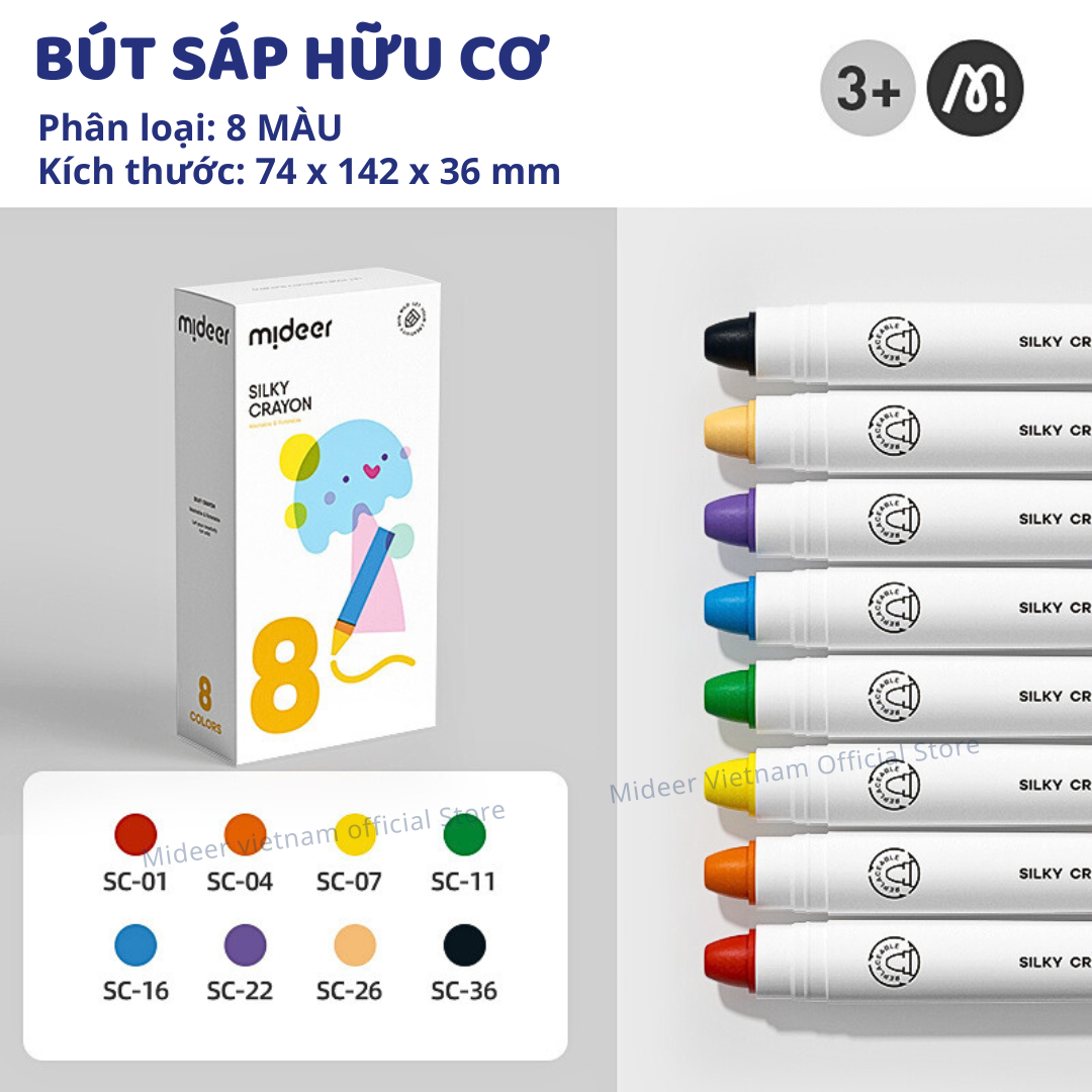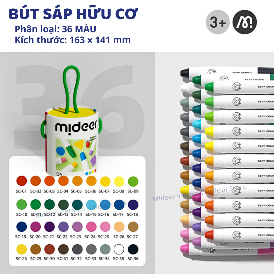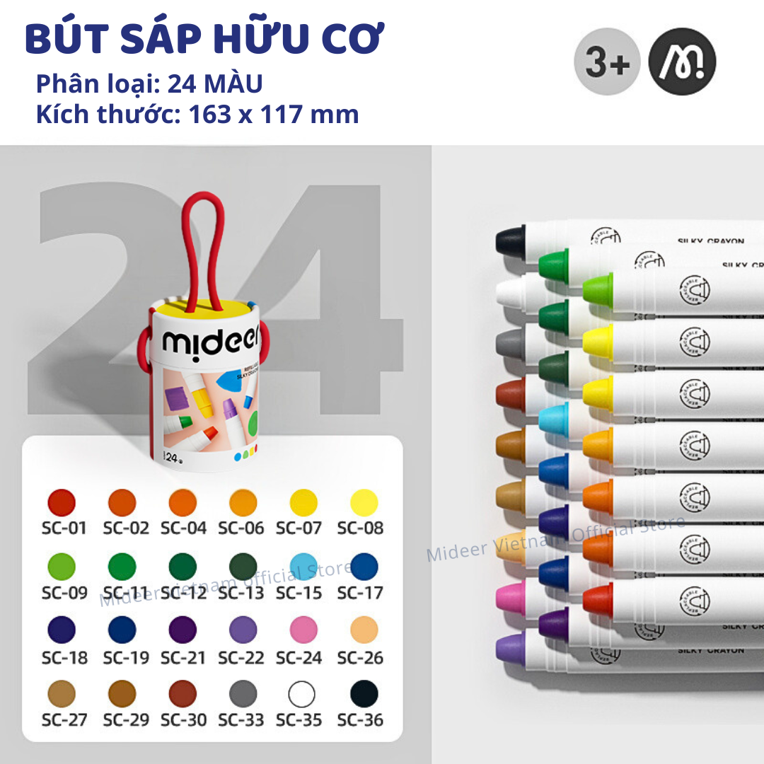 3. BÚT MÀU SÁP HỮU CƠ MIDEER SILKY CRAYON VỚI 3 CẢI TIẾN CHÍNH: Bộ màu cải tiến với công thức khô nhanh, an toàn, màu mịn và lõi lớn cho bé thỏa sức sáng tạo.
