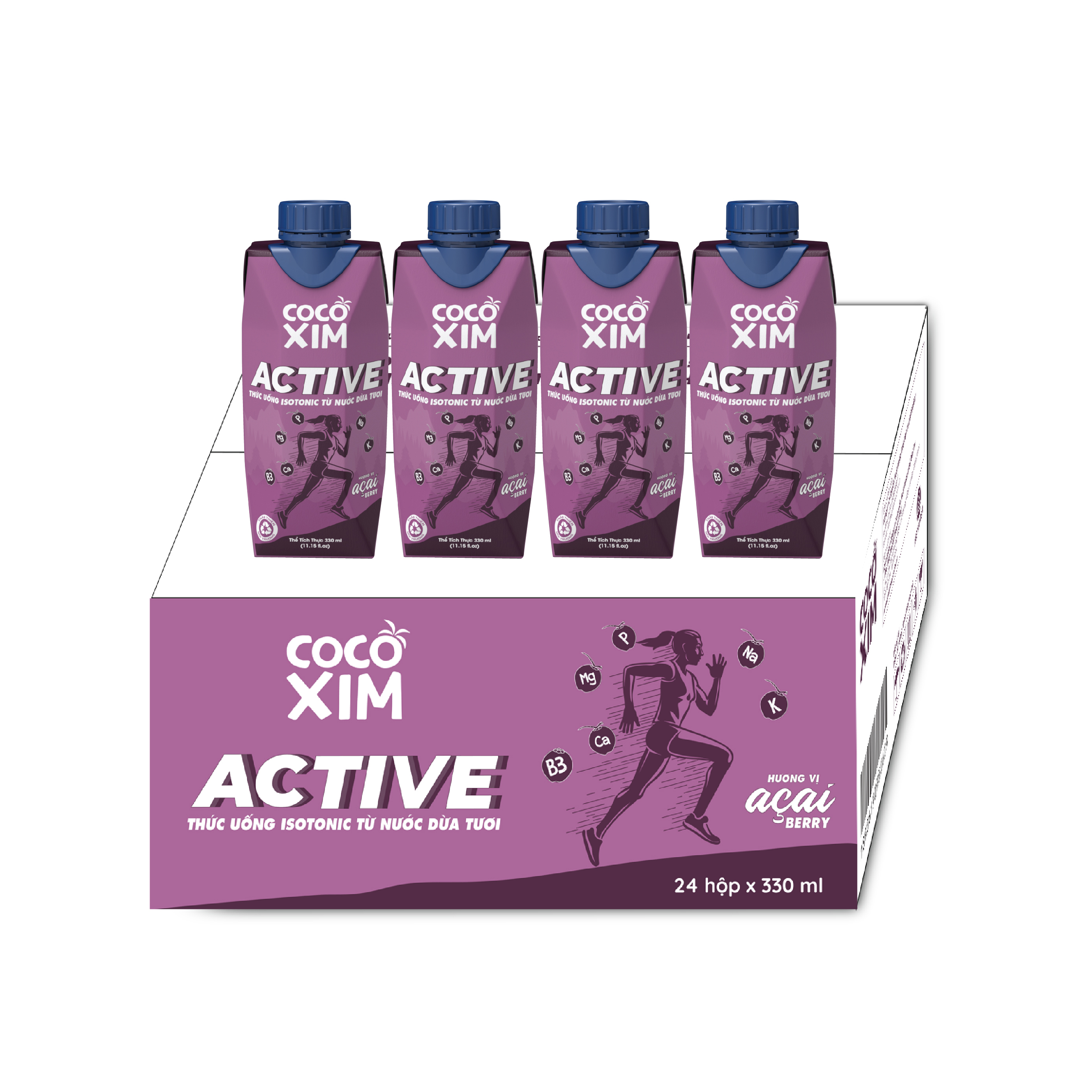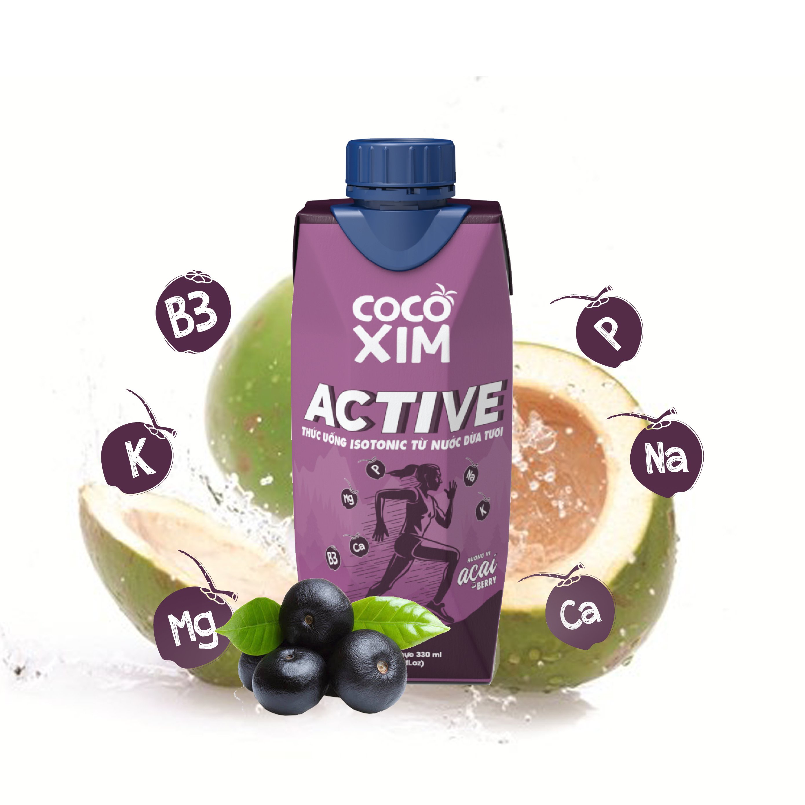 Nước trái cây thể thao Isotonic Active hương vị Acai Berry đóng hộp từ 100% Dừa tươi nguyên chất - Thương hiệu COCOXIM 330ml.