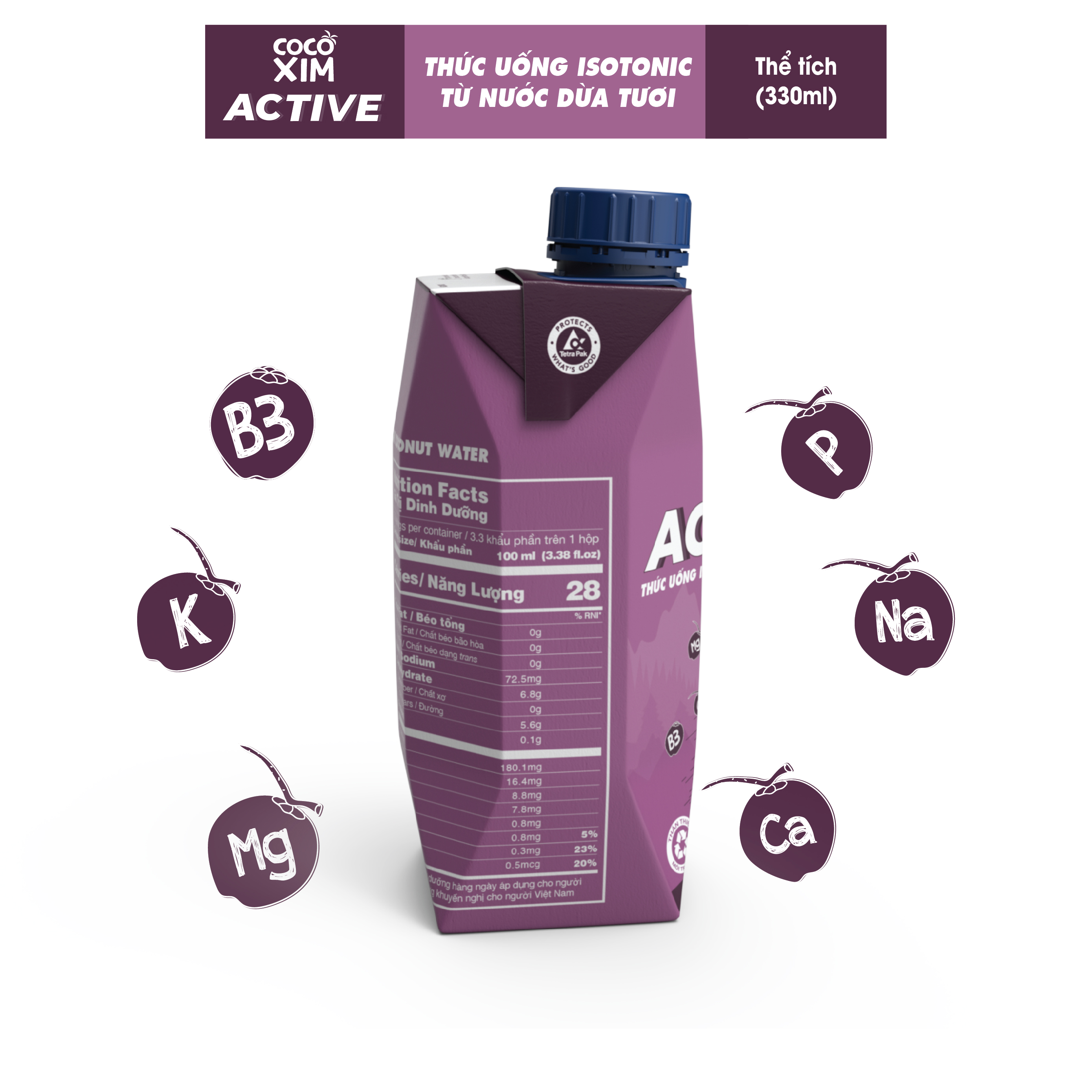 Nước trái cây Isotonic Cocoxim Active là dòng sản phẩm đầu tiên hoàn toàn đến từ thiên nhiên có bổ sung các loại muối khoáng và vi chất. 5 loại khoáng chất có sẵn trong nước dừa (Mg, Ca, Na, K, P) kết hợp với các loại vitamin nhóm B (B3, B5, B6, B12) sẽ giúp cho những người vừa vận động mạnh, tập thể dục thể thao,… phục hồi sức lực, nâng cao sức đề kháng và bù lại nước, khoáng chất nhanh chóng.