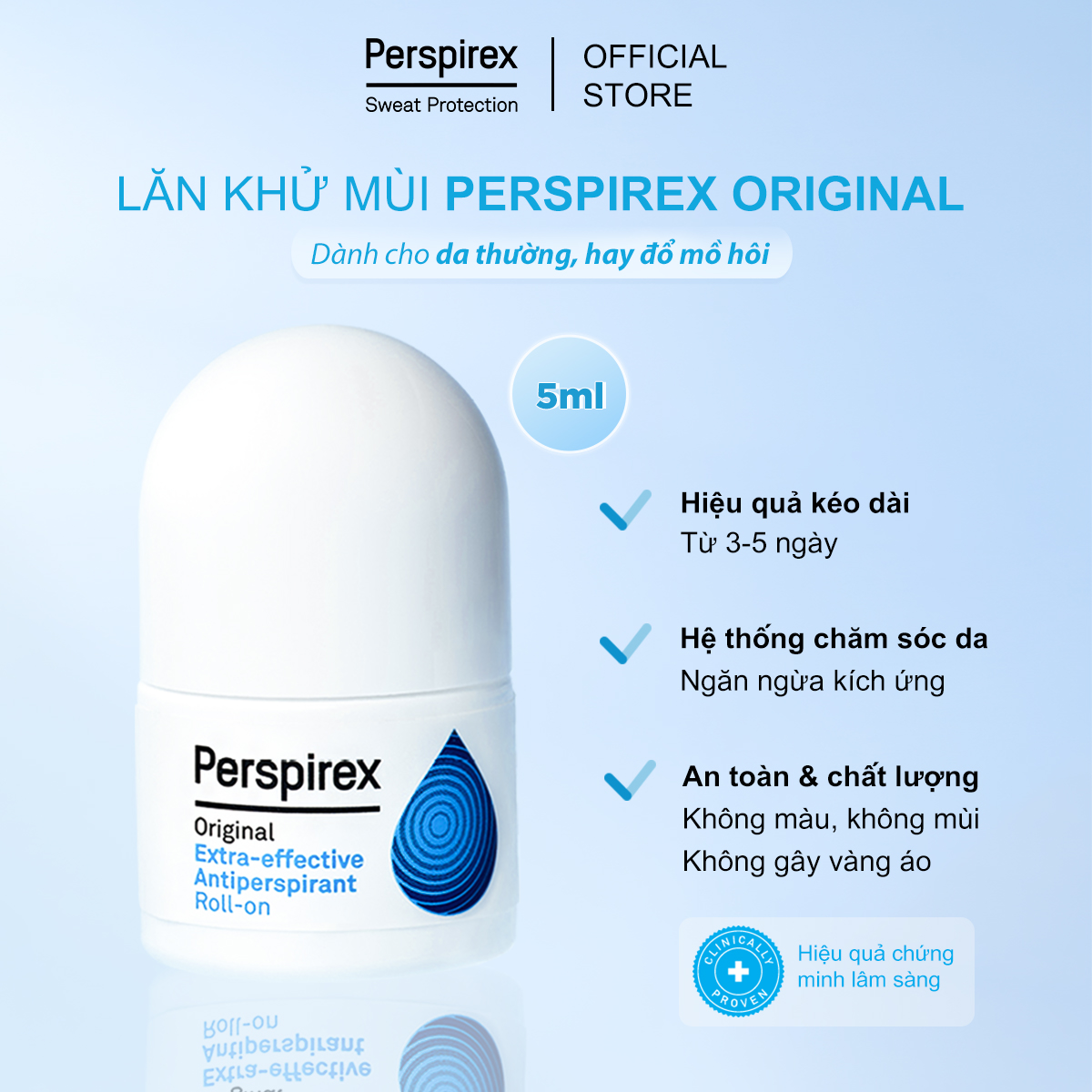 - Lăn khử mùi Perspirex Original: Dành cho da thường hay đổ mồ hôi, hiệu quả kéo dài 3-5 ngày.