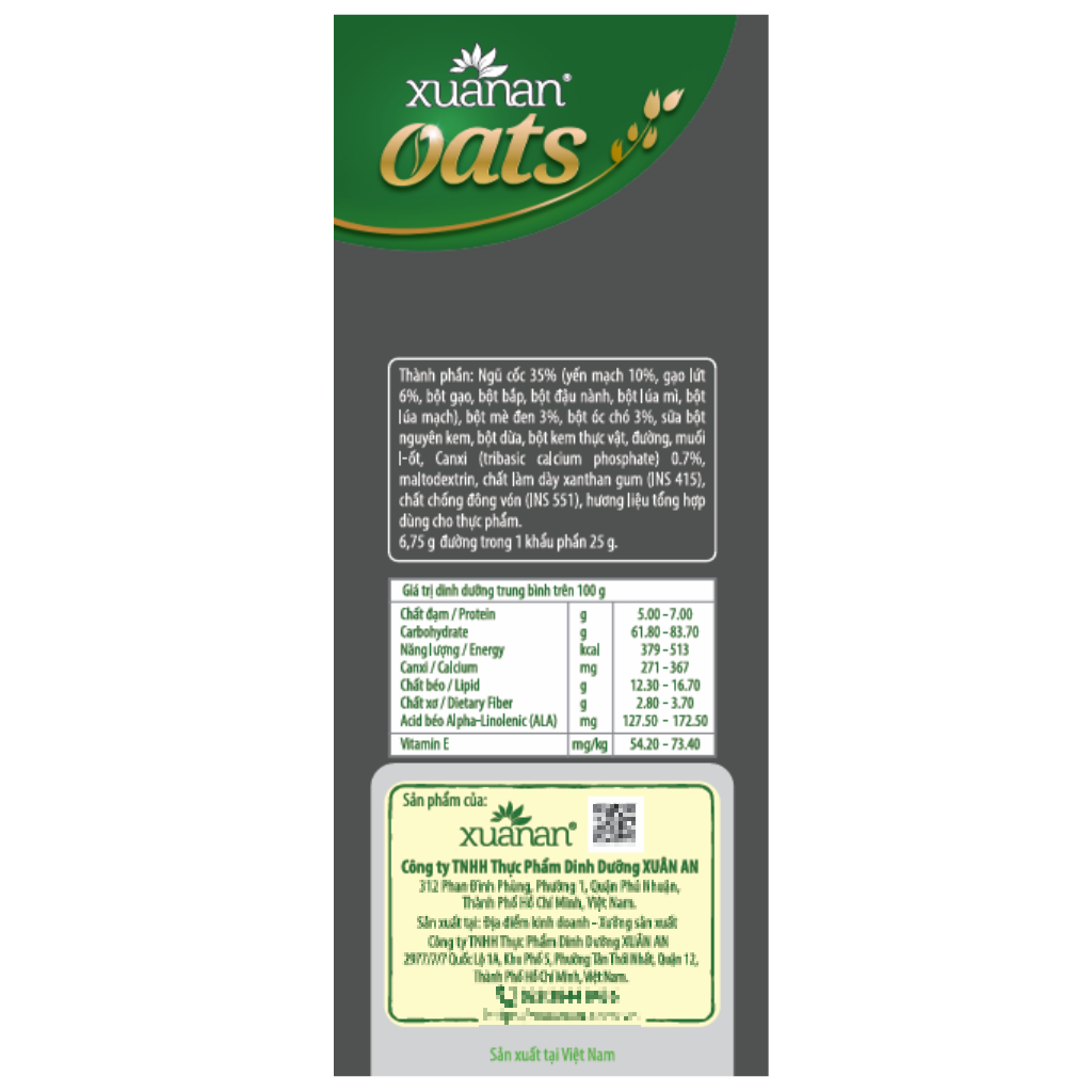Thành phần: Ngũ cốc 32% (Yến mạch 10%, gạo, gạo lứt 5%, bắp, đậu nành, lúa mì, lúa mạch), sữa bột nguyên kem, bột dừa, bột kem thực vật, đường, muối i-ốt, Canxi 0.7%, maltodextrin, chất là dày xanhthan gum (E415), chất chống đông vón (E551), hương liệu tổng hợp dùng cho thực phẩm. 7g đường trong 1 khẩu phần 25g.