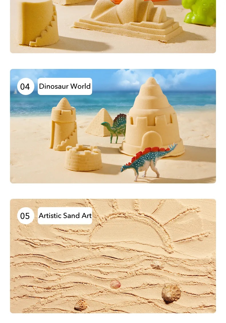 Với Bộ cát, dụng cụ và khay chơi cát, các bé có thể tạo hình lâu đài thủy cung tráng lệ, những động vật biển như cua, rùa hay bất cứ gì bé có thể nghĩ ra.