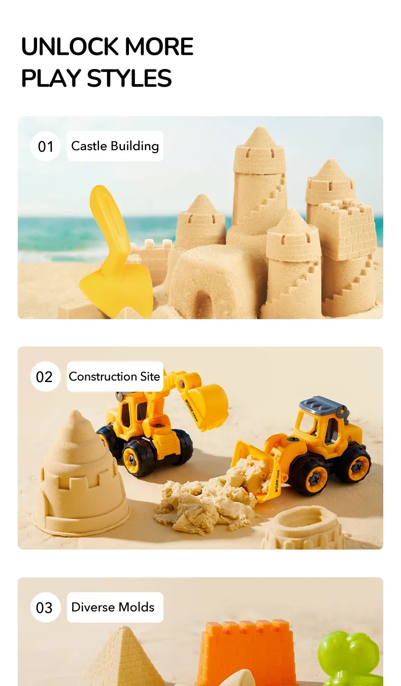 Cát động lực có đặc điểm là không dính tay, không độc hại, có độ kết dính cao nên dễ tạo hình và an toàn cho trẻ. Giúp trẻ tăng trí tưởng tượng và sự sáng tạo, đặc biệt bộ đồ chơi không độc hại và an toàn không gây kích ứng cho bé khi chơi.