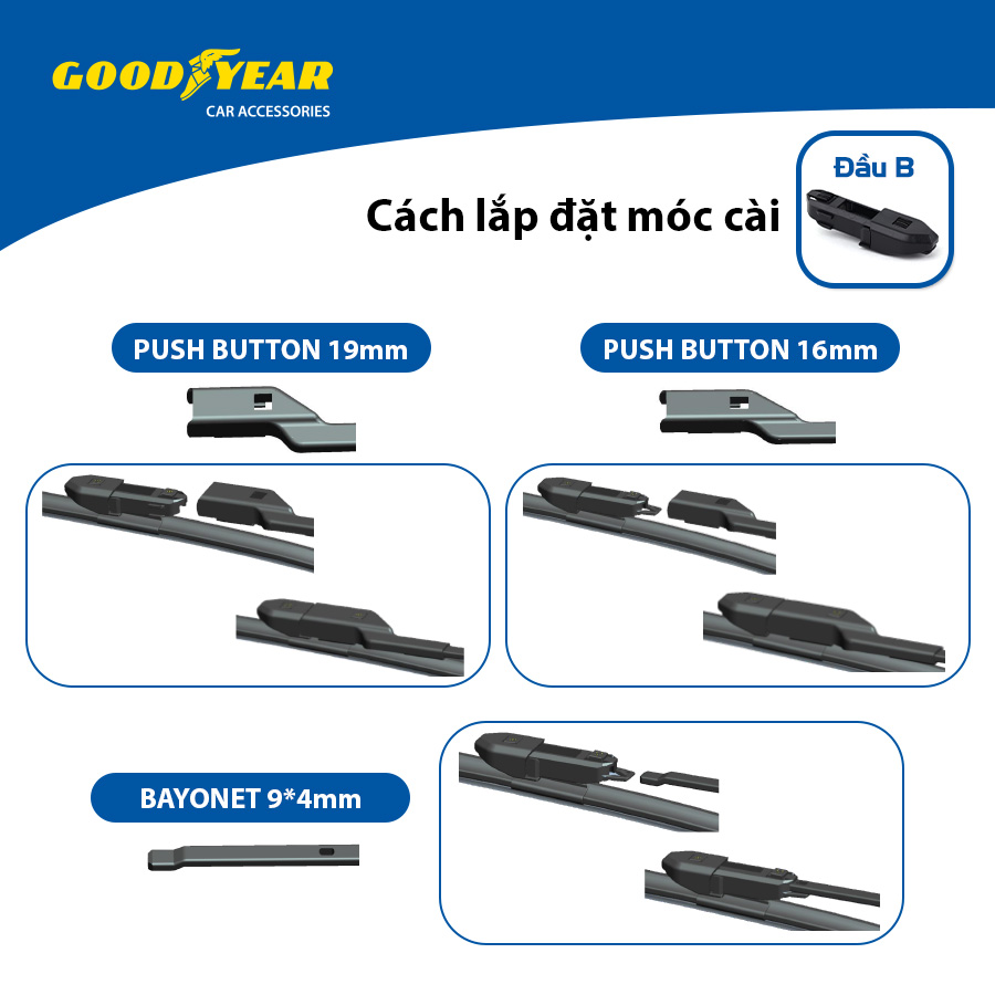 Gạt Mưa Không Xương GOODYEAR Chân Cài Đa Năng (Đầu A, B) Lắp Được Nhiều Dòng Xe Đặc Biệt - Nhập Khẩu Chính Hãng