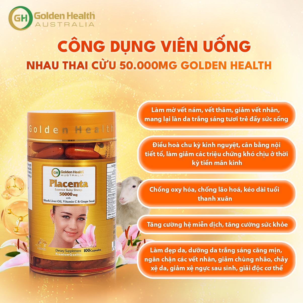 Viên Uống Nhau Thai Cừu Golden Health Placenta 50.000mg (Hộp 100 Viên) Giúp Làm Mờ Thâm, Nám,Tàn Nhang,Giúp Chống oxy Hoá Và Chống Lão Hoá Da