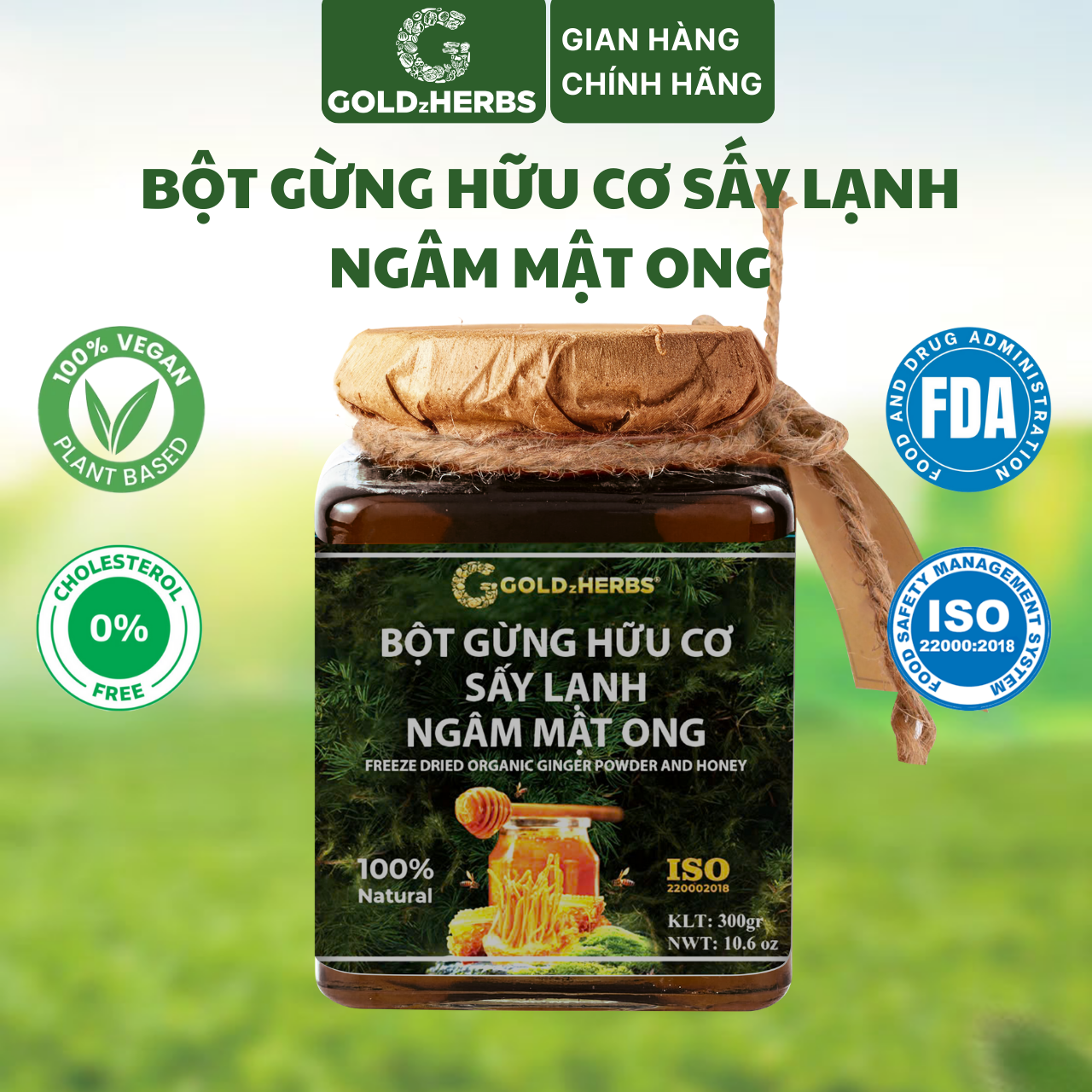 Bột gừng hữu cơ sấy lạnh ngâm mật ong GoldzHerbs, 100% mật ong nguyên chất – Hũ 300g/ Hộp 15 gói