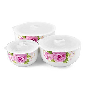 Bộ 3 thố sứ có nắp đậy chân không - có tay cầm -Giao hoa văn ngẫu nhiên