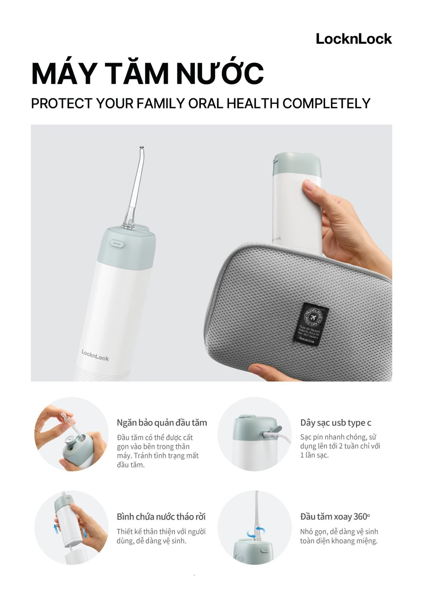 - NGĂN BẢO QUẢN ĐẦU TĂM: Đầu tăm có thể được cất gọn vào bên trong thân máy, tránh tình trạng mất đầu tăm, thuận tiện đi du lịch.