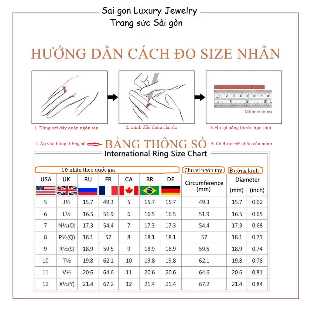 Hệ size tiêu chuẩn: USA – Khách xem kĩ ni tay (nếu chưa rõ có thể tra Youtube với từ khóa “ hướng dẫn đi cỡ nhẫn “ )