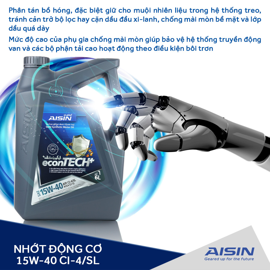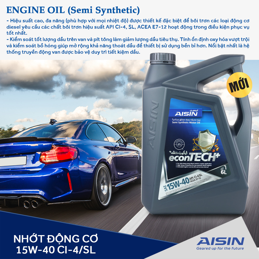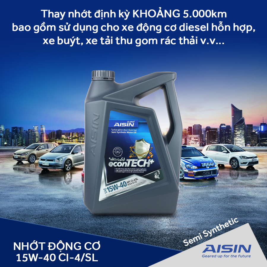 - Nhớt động cơ AISIN ECSI1546P 15W-40 CI4 / SL econTECH+ Semi Synthetic 6L là dầu nhớt bán tổng hợp chất lượng cao với công thức pha chế từ dầu gốc hệ thống phụ gia đạt hiệu suất cao và chỉ số nhớt đứng hàng đầu theo tiêu chuẩn API SN.
