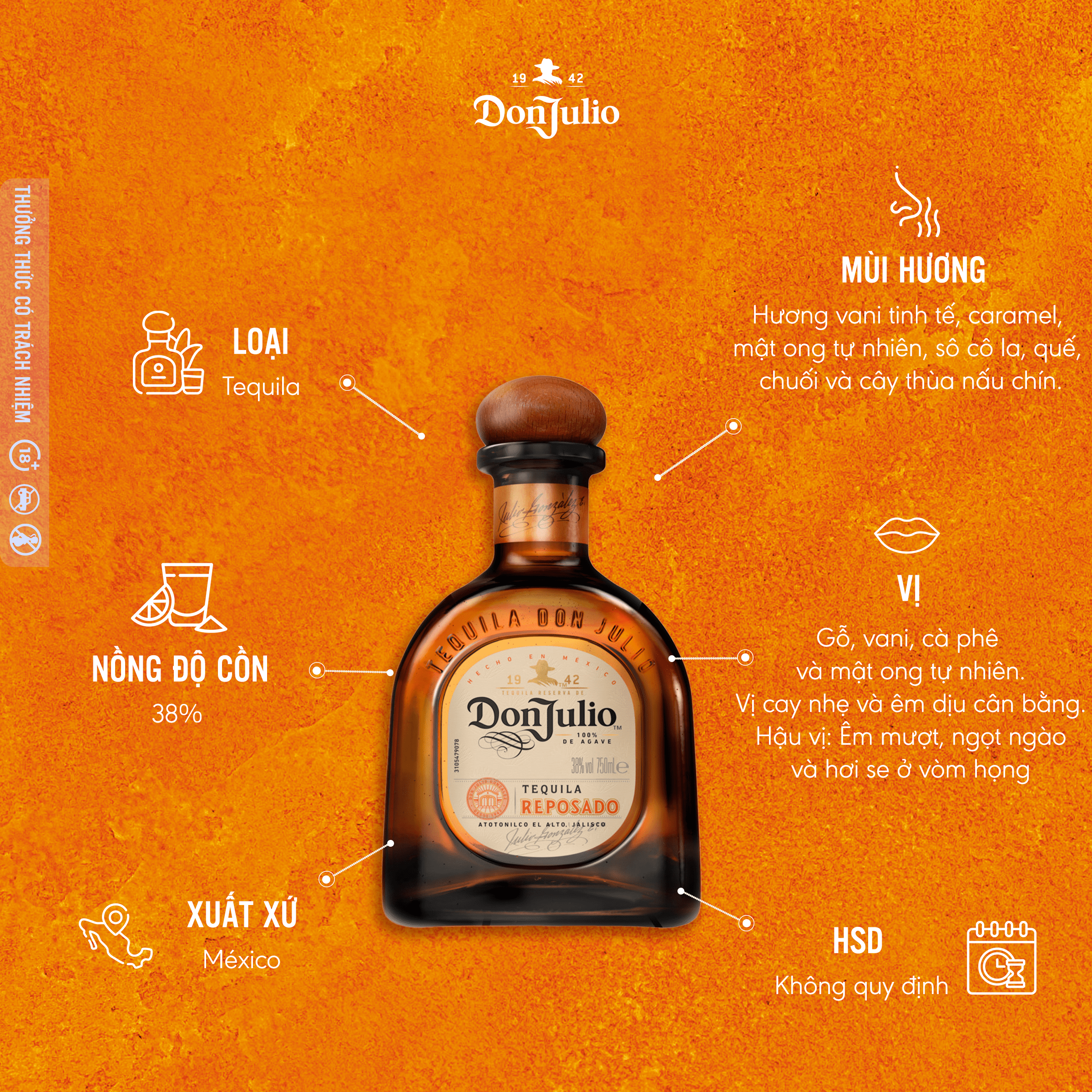 Được ủ trong thùng gỗ sồi trắng Mỹ trong tám tháng, Don Julio Reposado Tequila có màu hổ phách vàng, và mang đến hương vị đậm đà, êm dịu - chính là tinh túy của loại tequila ủ trong thùng gỗ sồi hoàn hảo. Với hương vị êm dịu, thanh lịch và mùi thơm hấp dẫn, Don Julio Reposado Tequila ngon nhất khi thưởng thức như một phần của một loại cocktail có hương vị sảng khoái hoặc ướp lạnh với đá.