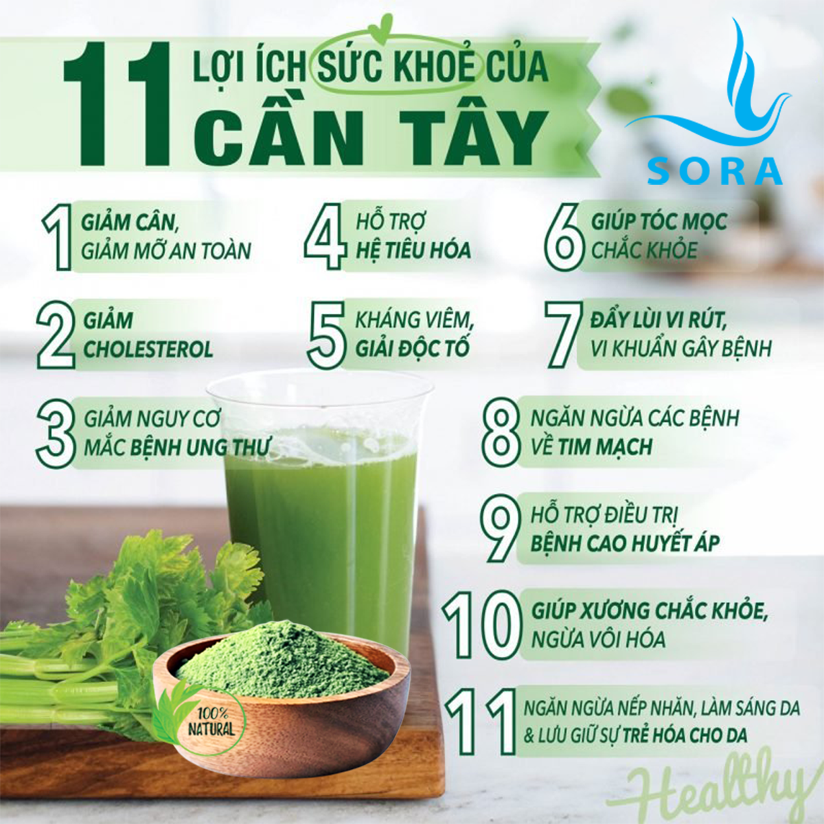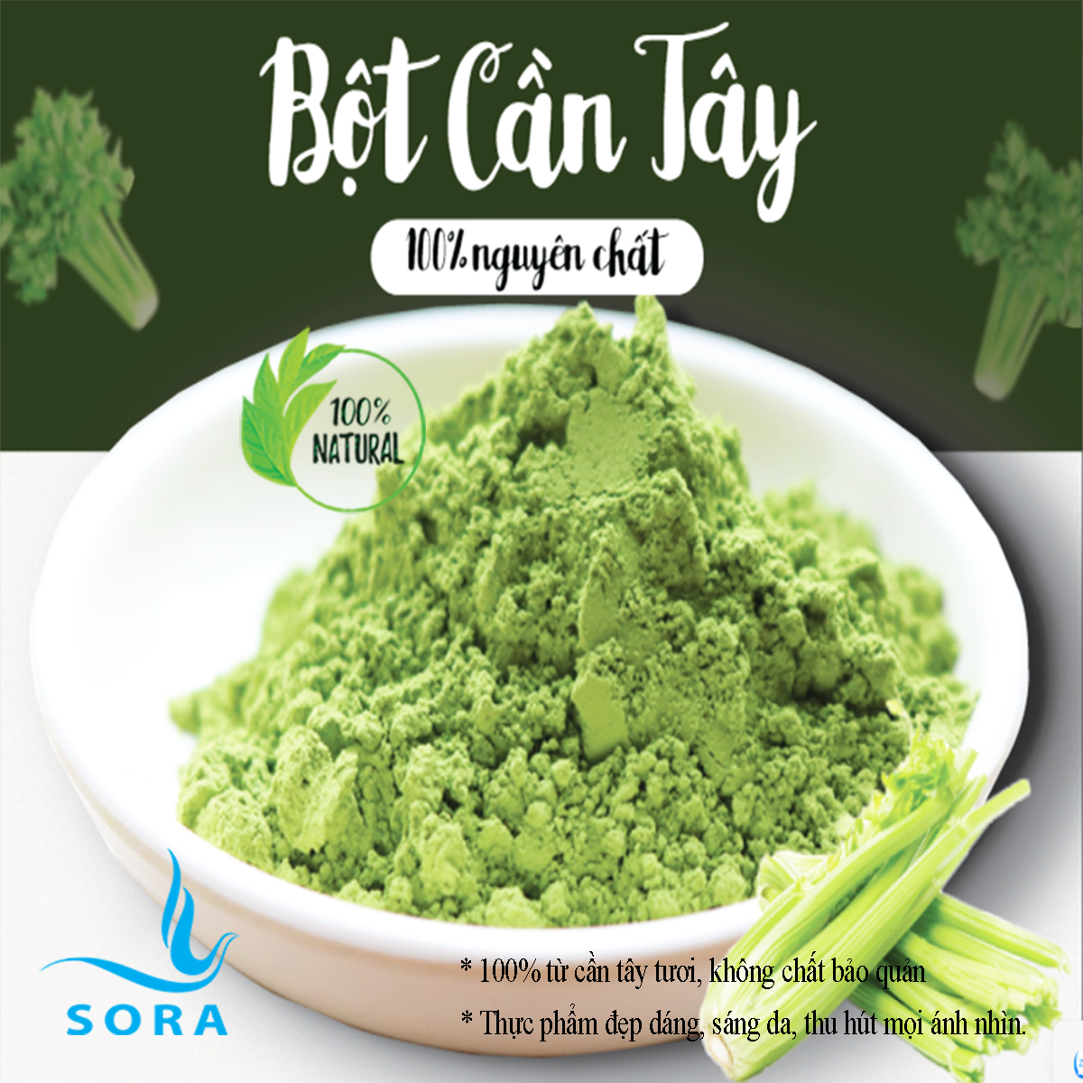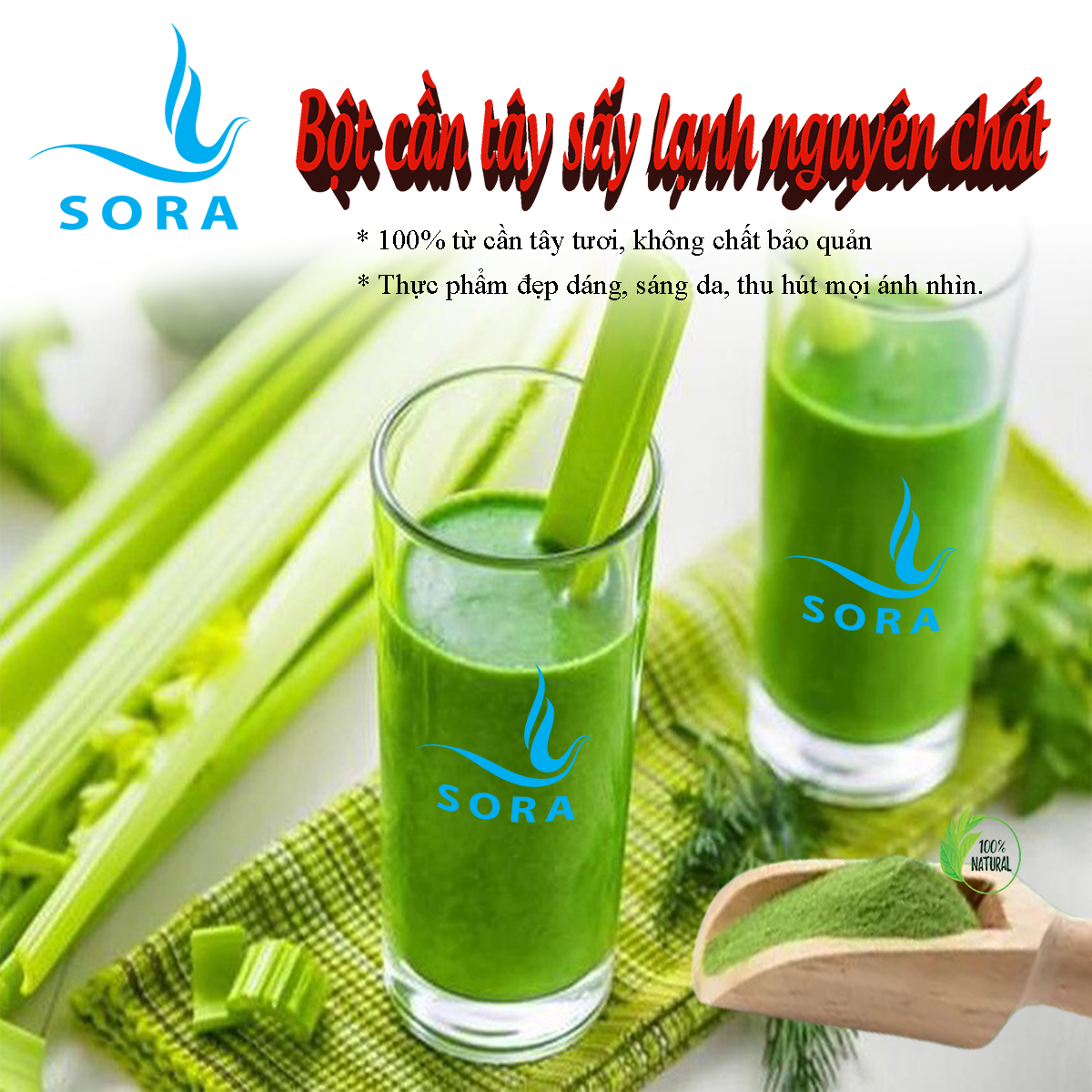 Bột cần tây sấy lạnh nguyên chất Sora là sản phẩm tự nhiên được sấy lạnh hoàn toàn từ rau cần tây tươi, không hề có chất bảo quản nên sẽ giữ nguyên vẹn được độ tinh khiết của các dưỡng chất bên trong. Bột cần tây sấy lạnh nguyên chất Sora chứa rất nhiều thành phần dinh dưỡng quan trọng và các khoáng chất vi lượng như canxi, sắt, chất xơ,... Song song đó thì tinh dầu tự nhiên có trong Bột cần tây sấy lạnh nguyên chất Sora sẽ giúp mọi người an thần cực tốt.