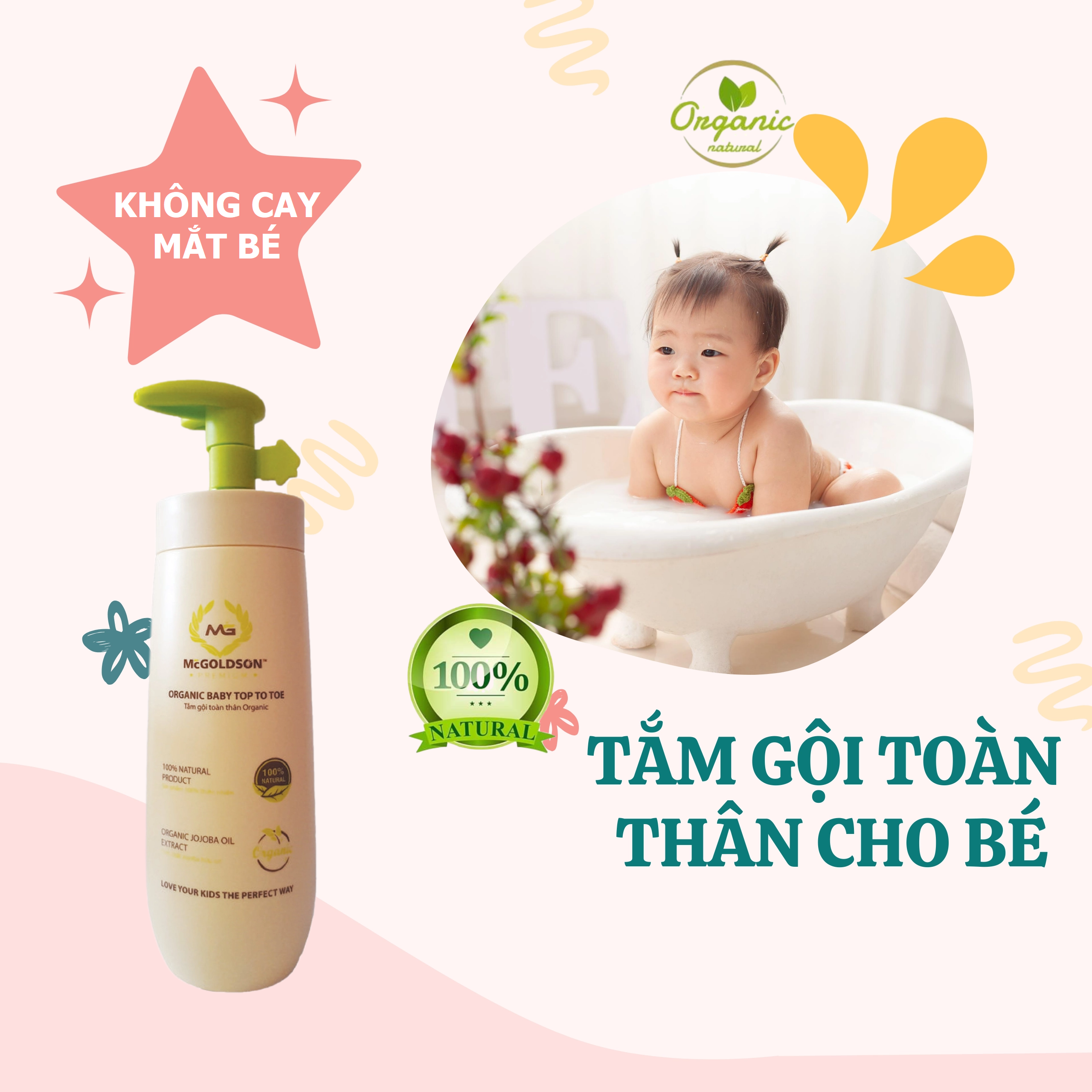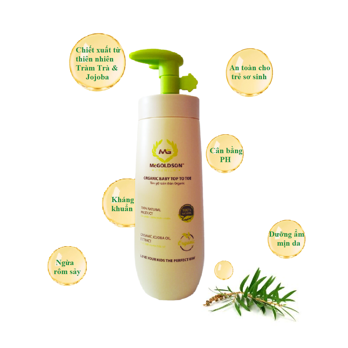 - Tắm gội toàn thân Organic sử dụng các thành phần dịu nhẹ có nguồn gốc hoàn toàn 100% thiên nhiên , không gây cay mắt, an toàn với làn da mỏng manh, nhạy cảm của trẻ nhỏ. Sự kết hợp giữa Tinh chất jojoba hữu cơ với Tràm trà giúp làm sạch, mềm, mịn da và tóc, hạn chế sự mất nước giảm viêm da, ngừa hăm và rôm sảy.