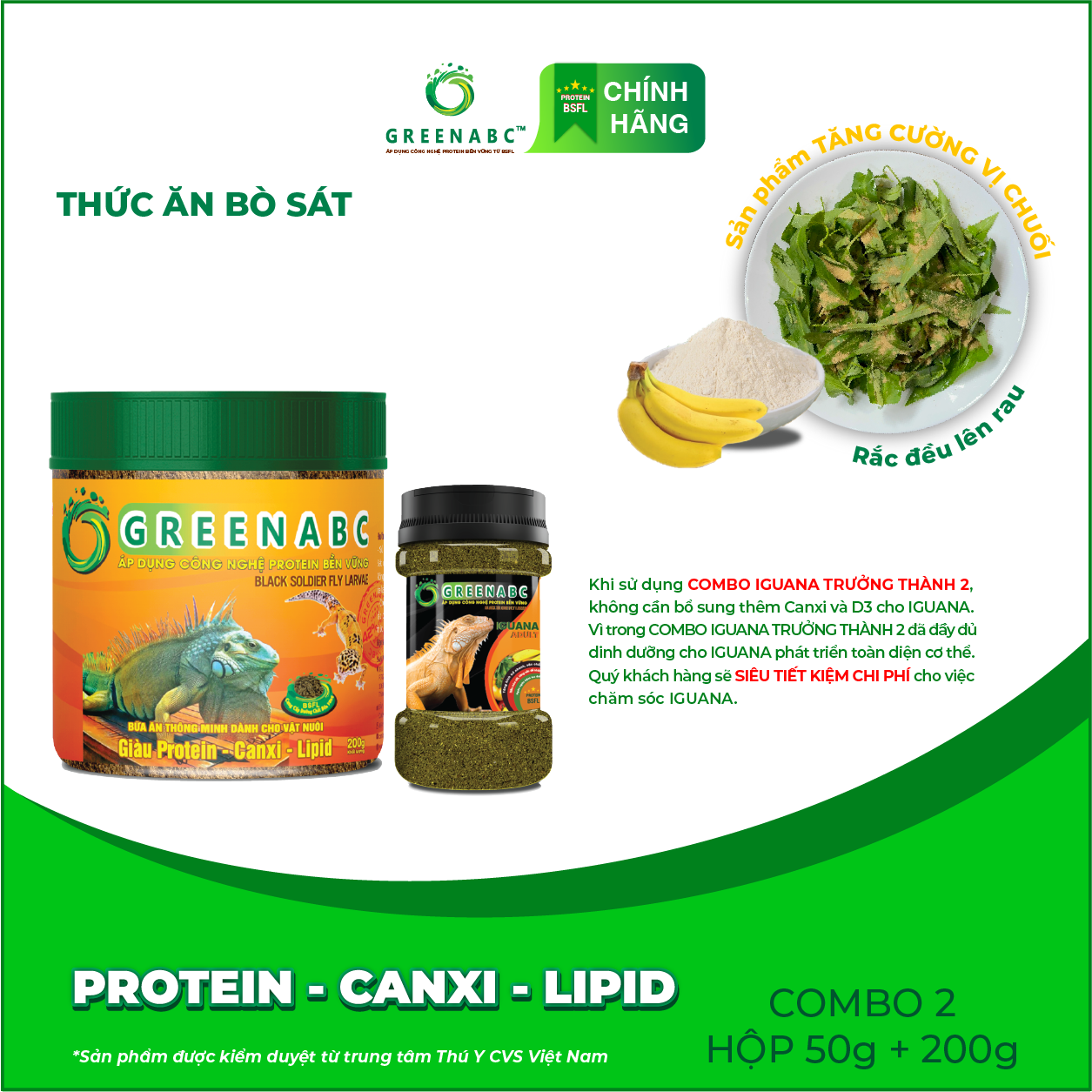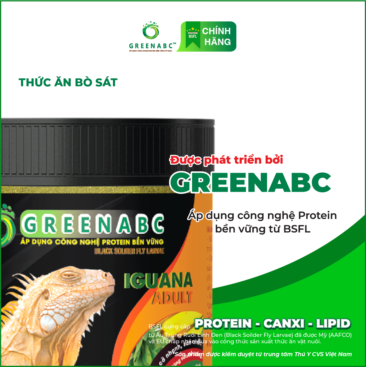 GREENABC là thức ăn cao cấp dành cho Iguana Trưởng Thành - Rồng Nam Mỹ Trưởng Thành. Đặc biệt sản phẩm GREENABC được sản xuất theo phương pháp Áp dụng công nghệ PROTEIN bền vững từ bột đạm G.Meal rất giàu PROTEIN – CANXI – LIPID có trong BSFL*, đã được Mỹ (AAFCO)* và EU chấp nhận đưa vào công thức cho ngành sản xuất thức ăn dành cho vật nuôi.