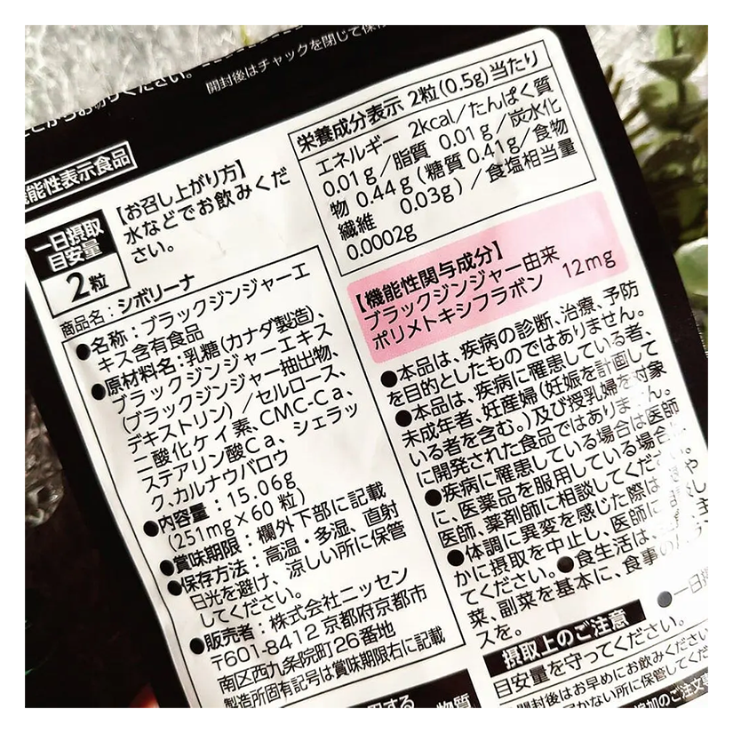 Thành phần trong 2 viên nén: Bột chiết xuất gừng đen (Kaempferia parviflora) 110,94 mg.