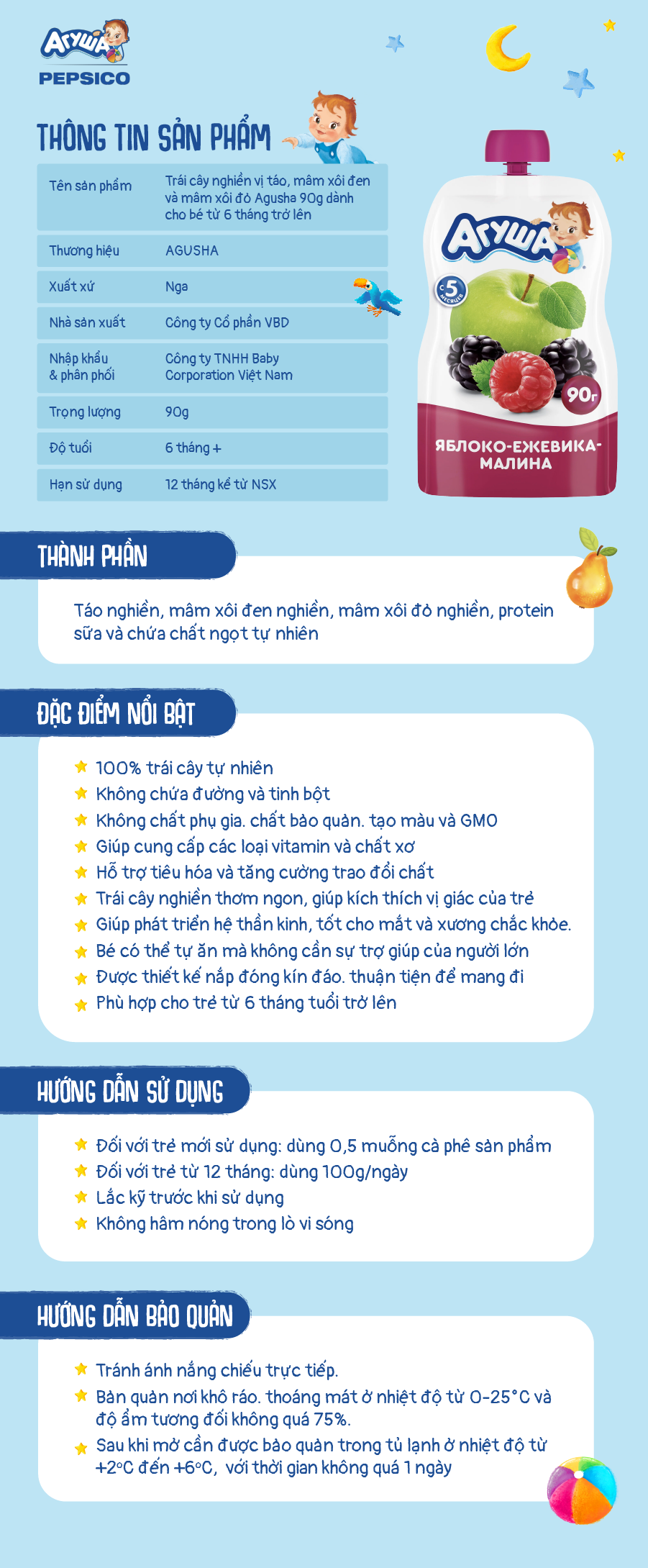 Trái cây nghiền vị táo, mâm xôi đen và mâm xôi đỏ Agusha 90g dành cho bé từ 6 tháng trở lên