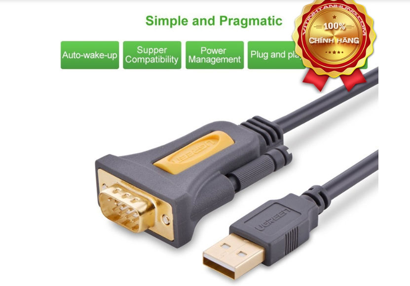 - Cáp chuyển đổi USB 2.0 ra COM RS232 1,5m cao cấp Ugreen 20211 là thiết bị được sản xuất bởi thương hiệu uy tín Ugreen được thiết kế để kết nối máy tính, laptop, … với các thiết bị như Digital Camera, máy đọc mã vạch, máy quét thẻ, và các thiết bị có cổng COM 9 chân khác với lõi đồng nguyên chất 100%, chống nhiễu, chống oxy hóa, hai đầu tiếp xúc được mạ vàng 24k đảm bảo chất lượng truyền tải tín hiệu và tốc độ ổn định tốt nhất.