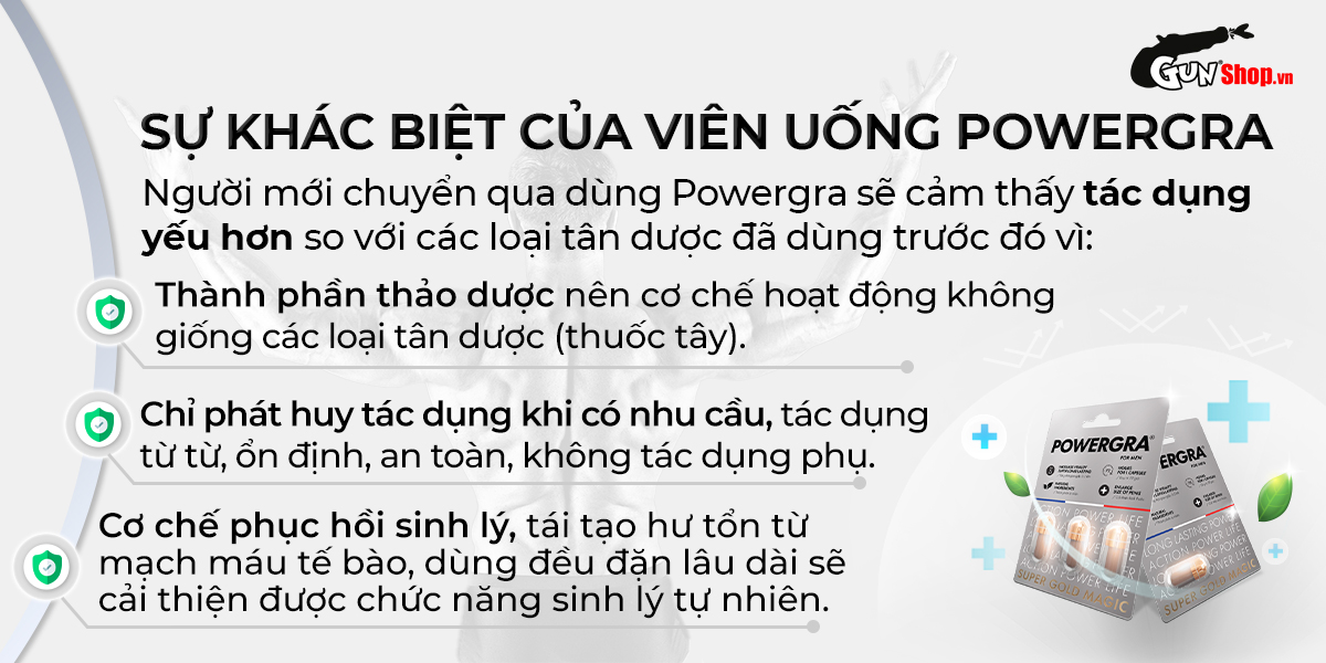 ✪ Thông tin: Powergra For Men được tổng hợp từ các loại thảo dược tự nhiên cao cấp và quý hiếm nên cực kỳ an toàn và tốt cho sức khỏe của người sử dụng. Sản phẩm có tác dụng giúp bổ thận, giúp tăng cường sinh lực, tăng cường sinh lý, tăng độ cứng, tăng thời gian hoạt động. Chỉ cần uống 1 viên 2 tiếng trước khi quan hệ, bạn sẽ trở nên sung mãn và phong độ hơn bao giờ hết. Đặc biệt, ngoài tác dụng nhanh tại chỗ, sản phẩm còn giúp bồi bổ cơ thể, giúp cải thiện và phục hồi sinh lý về lâu dài, giúp bạn chấm dứt được tình trạng sinh lý kém làm bạn mất sự tự tin bấy lâu nay.