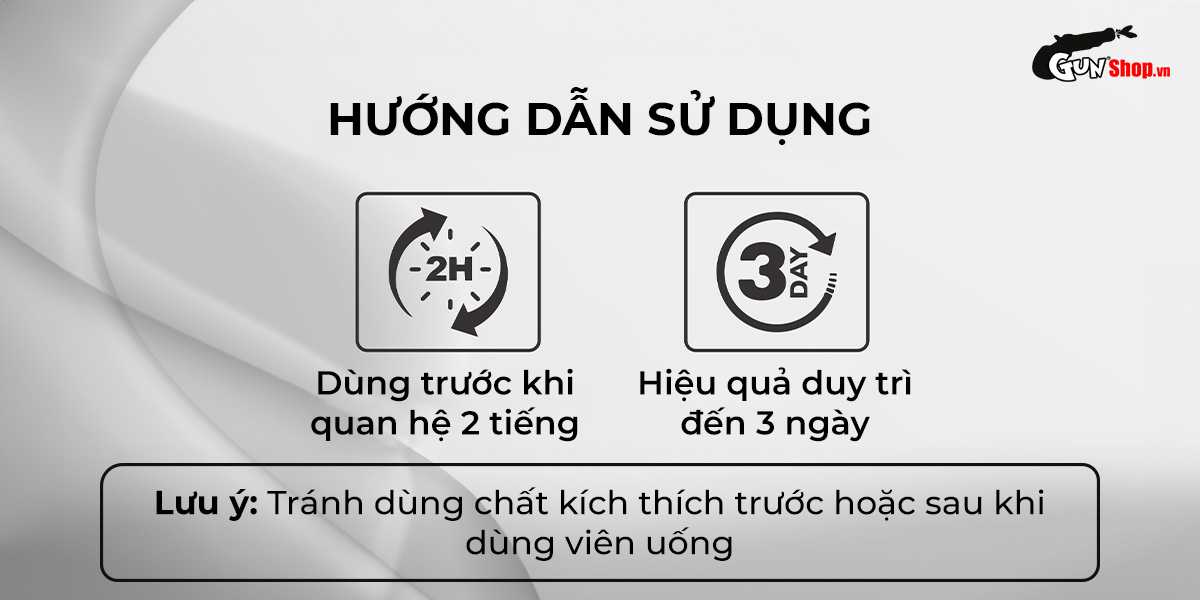 ✪ Cách dùng: Bước 1: Uống trực tiếp 1 viên Powergra trước khi có hoạt động thể chất. Bước 2: Dùng khăn lau tặng kèm lau lên thân "cậu bé" trước khi hoạt động 5 phút để vệ sinh làm sạch và tăng thêm thời gian.