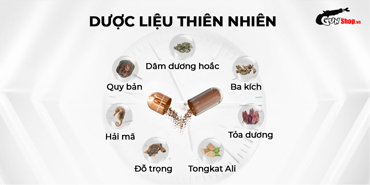 ✪ Thành phần: Eurycoma longifolia; Hippocampus; Morinda oficinnalis stow; Epimedium; Cynomorium; Clemmy chinensis tortoise; Eucommia ulmoides; Horse Bone Extract; Zn gluconate; Gelatin; Talc; Magie stearat; Gelatin.
