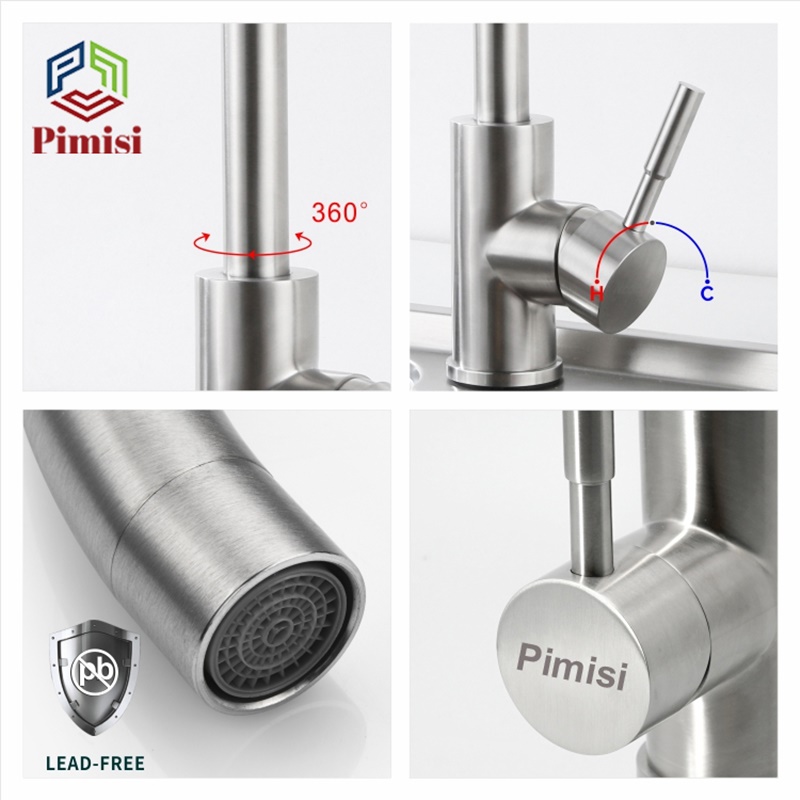 Vòi rửa bát nóng lạnh inox 304 Pimisi dùng cho chậu rửa chén bát trong nhà bếp gắn chậu - bàn đá, quay 360 độ dùng được cho chậu rửa chén 2 hố - đã kèm 2 sợi dây cấp nước | Hàng chính hãng