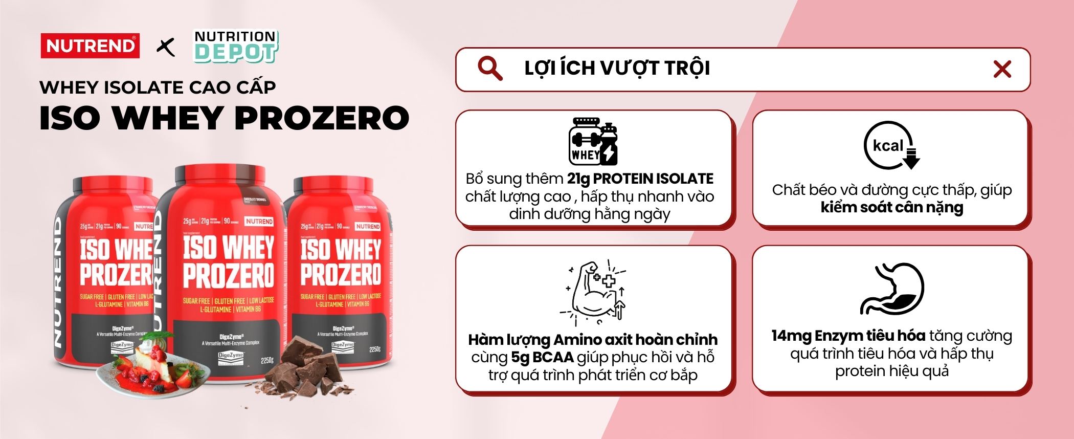 - Nutrend ISO WHEY Prozero là một sự hỗ trợ tuyệt vời cho mọi mục tiêu luyện tập, bất kể mục tiêu cá nhân của bạn là phát triển thật nhiều cơ bắp hay đơn giản là để có cơ thể săn chắc hơn hoặc cần nạp thêm protein vào chế độ ăn uống hàng ngày.