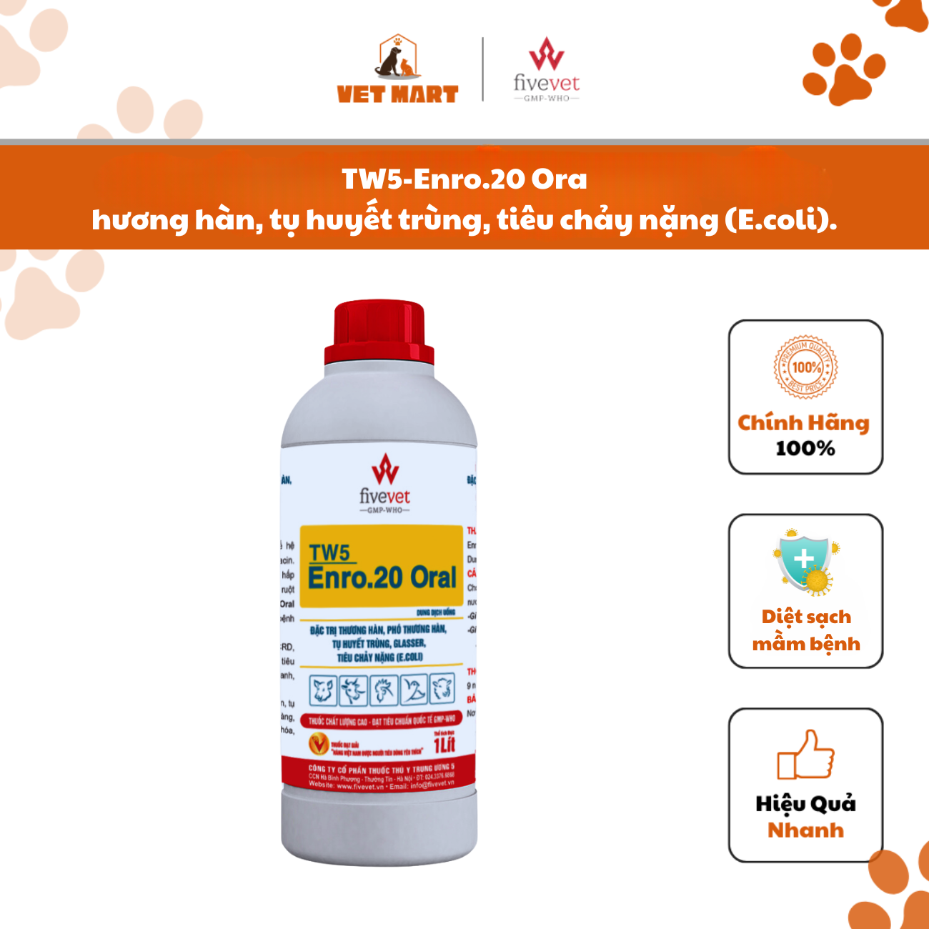 TW5-Enro.20 Oral – Hỗ Trợ Bảo Vệ Sức Khỏe Đường Tiêu Hóa Và Hô Hấp Cho Vật Nuôi