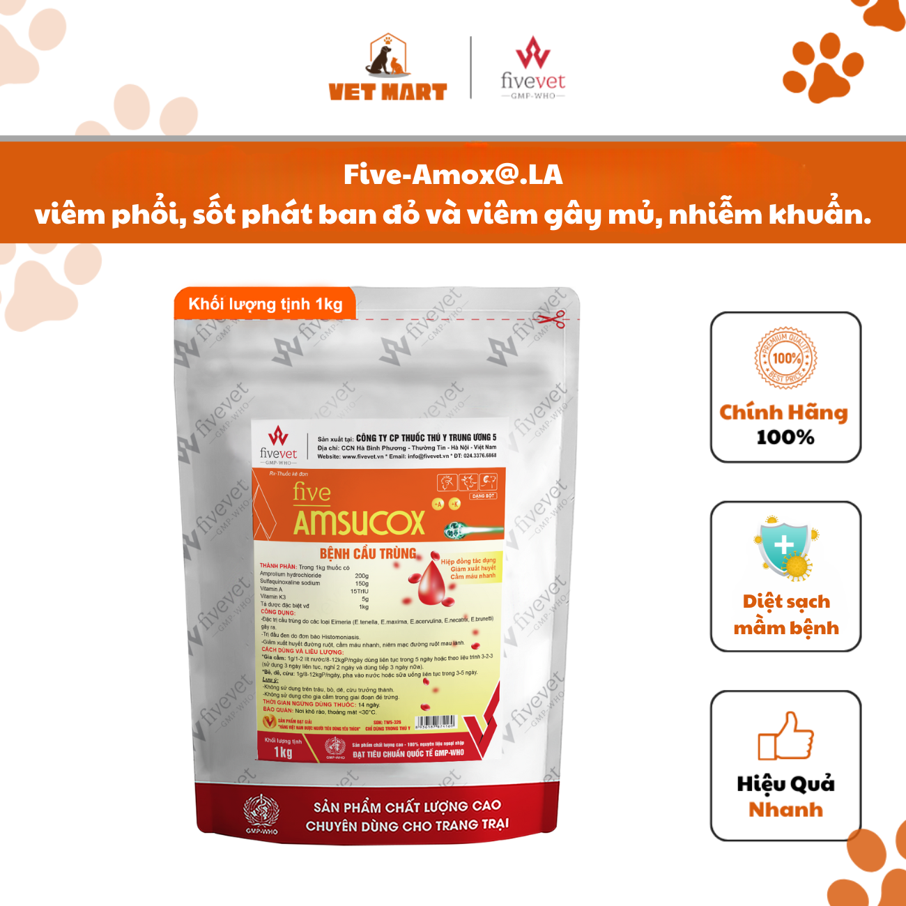 Bạn cần một giải pháp hiệu quả để hỗ trợ vật nuôi chống lại các vấn đề do cầu trùng gây ra? Five-AmSuCox chính là lựa chọn hoàn hảo, giúp bảo vệ sức khỏe vật nuôi toàn diện, đặc biệt trong việc hỗ trợ đường ruột và kiểm soát ký sinh trùng.