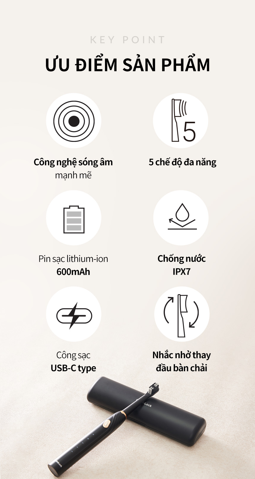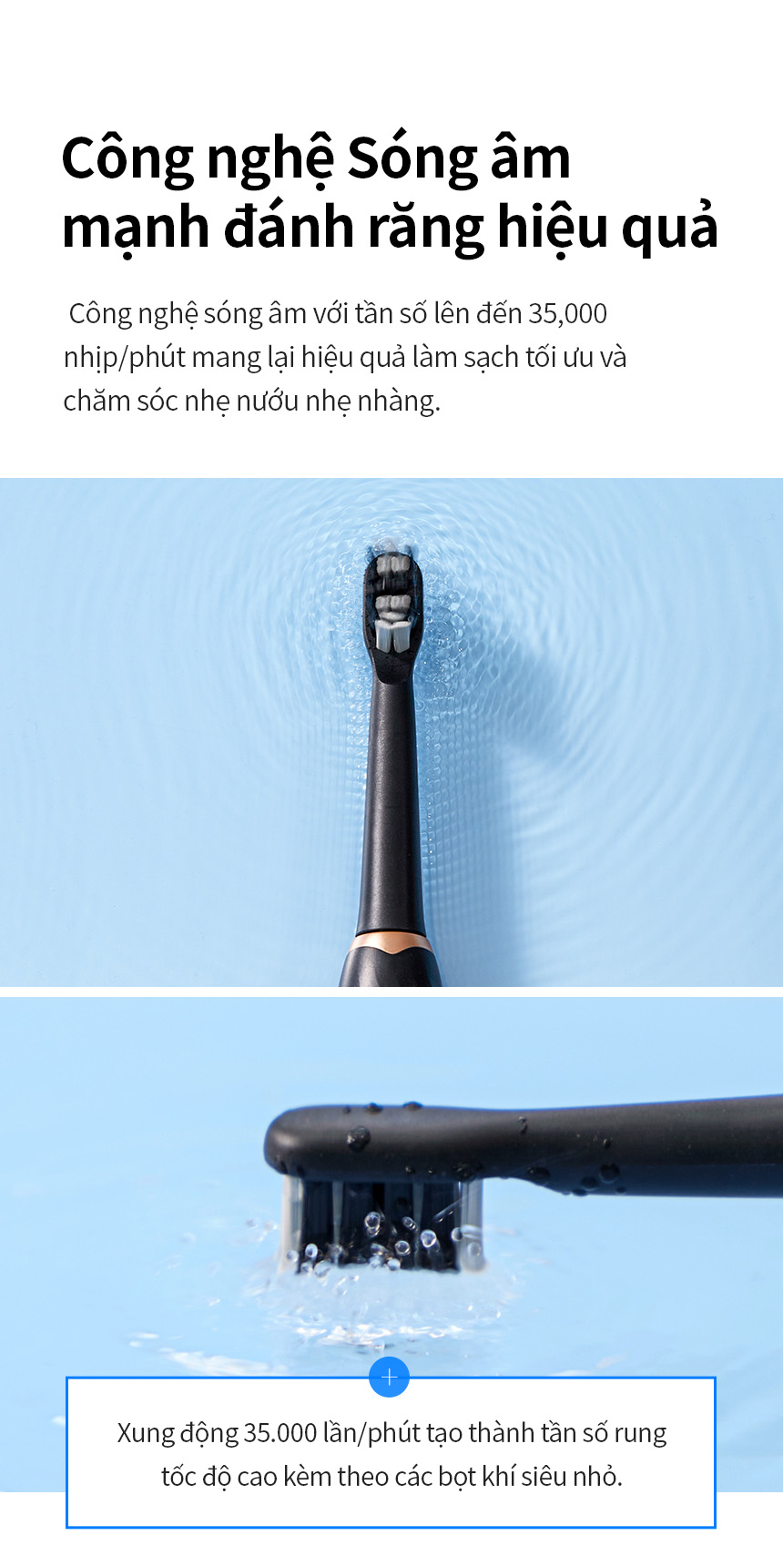- XUNG ĐỘNG MẠNH MẼ: Công nghệ sóng âm với tần số lên đến 35,000 nhịp/phút mang lại hiệu quả làm sạch tối ưu.