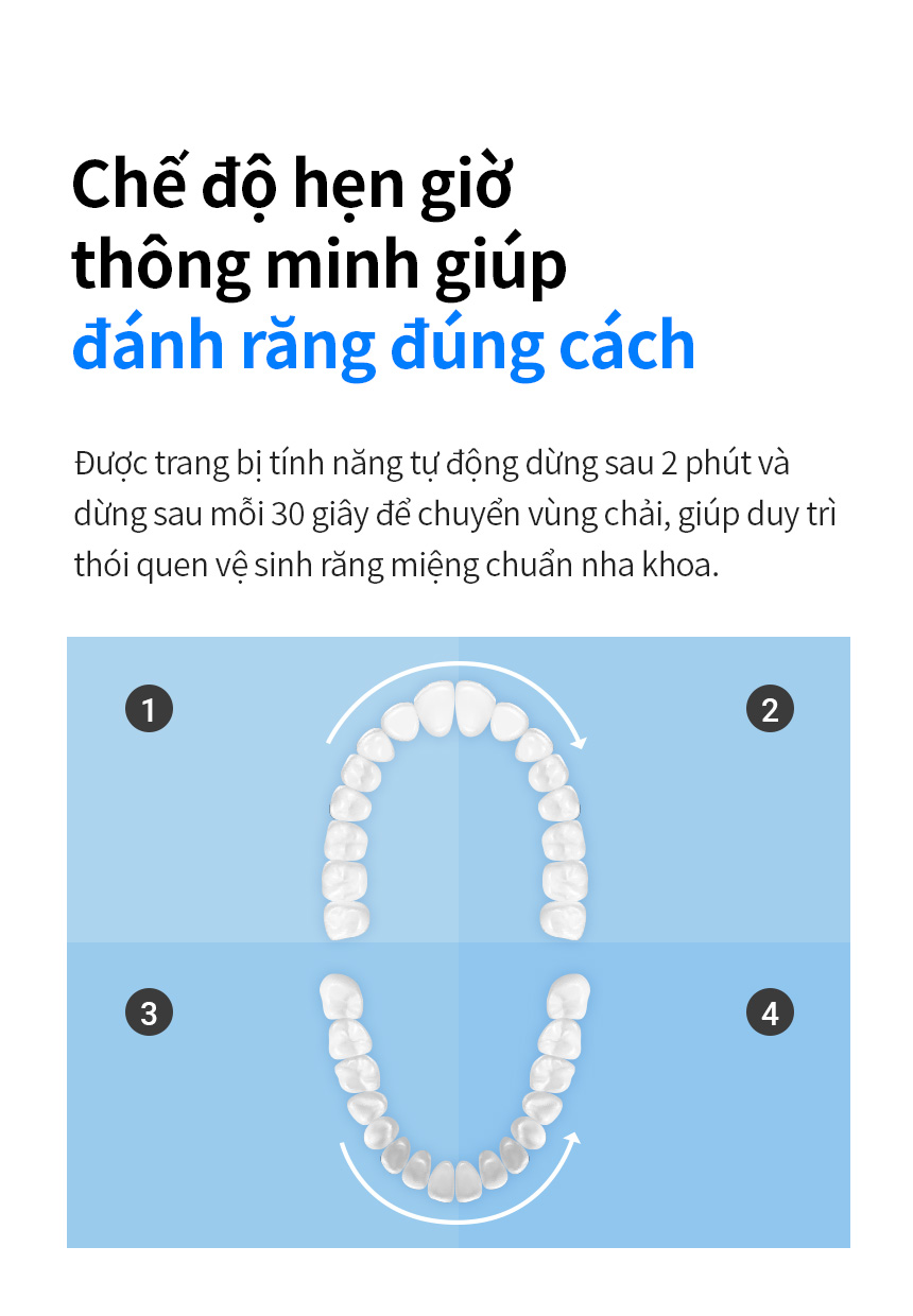 - CHẾ ĐỘ HẸN GIỜ THÔNG MINH: Được trang bị tính năng tự động dừng sau 2 phút và dừng sau mỗi 30 giây để chuyển vùng chải, giúp duy trì thói quen vệ sinh răng miệng chuẩn nha khoa.