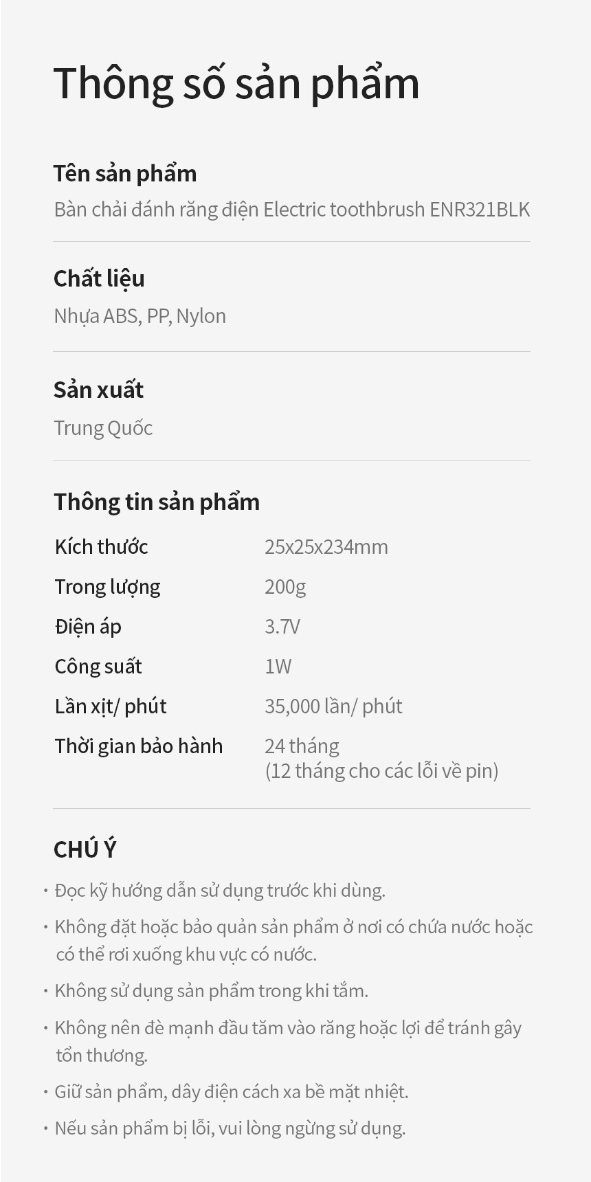Sản phẩm bàn chải ENR321BLK bao gồm: 01 thân bàn chải, 02 đầu bàn chải, 01 cáp sạc, 01 hộp đựng