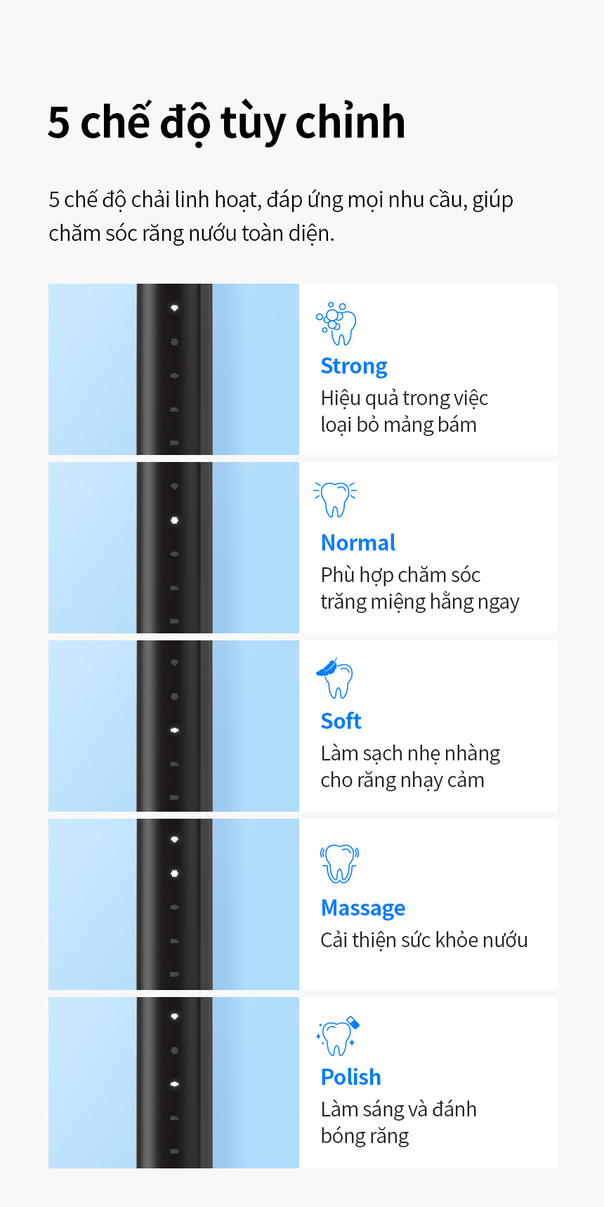 - 5 CHẾ ĐỘ HOẠT ĐỘNG: 5 chế độ chải linh hoạt, đáp ứng mọi nhu cầu, giúp chăm sóc răng nướu toàn diện.