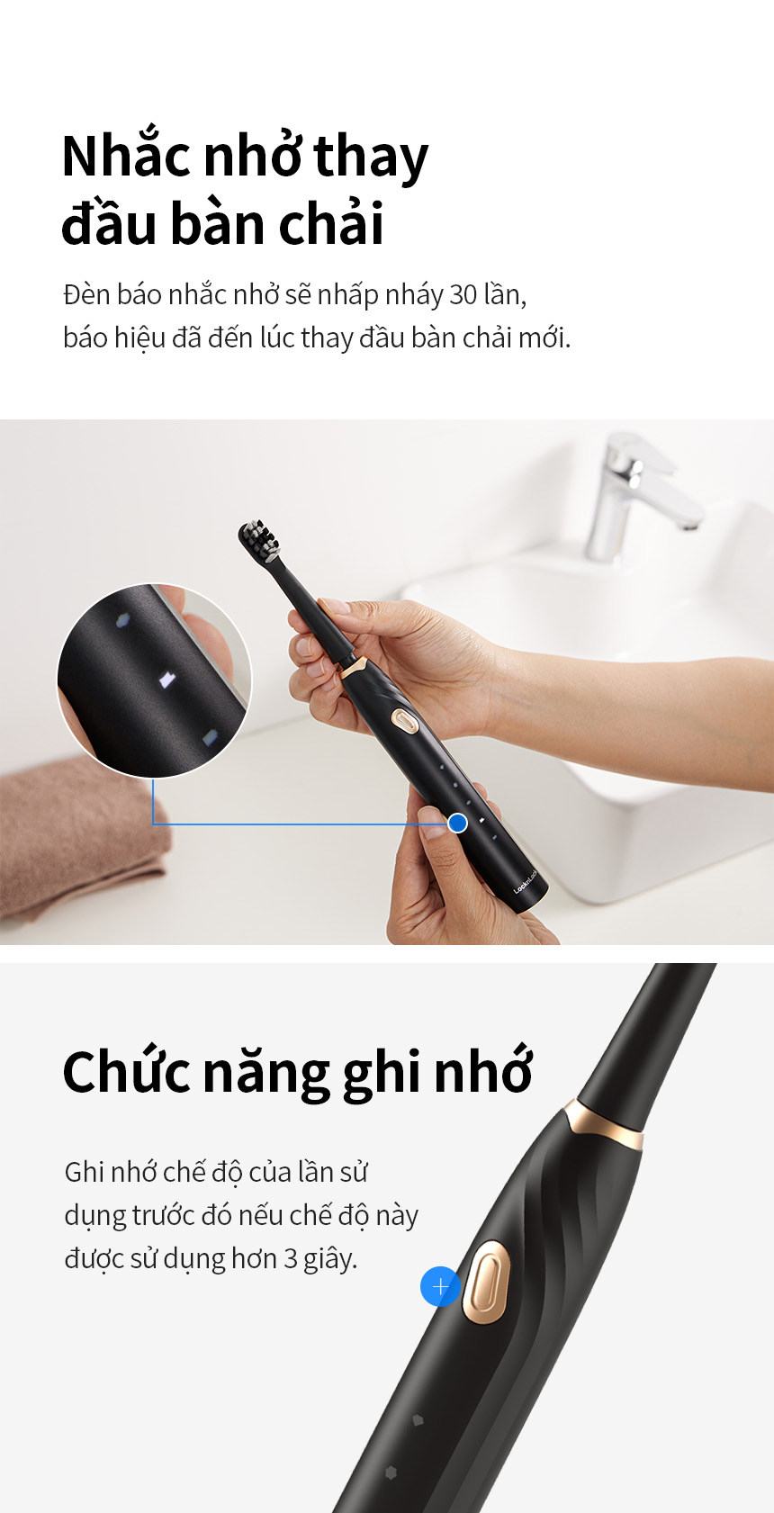 - NHẮC NHỞ THAY ĐẦU BÀN CHẢI: Đèn báo nhắc nhở sẽ nhấp nháy 30 lần, báo hiệu đã đến lúc thay đầu bàn chải mới.