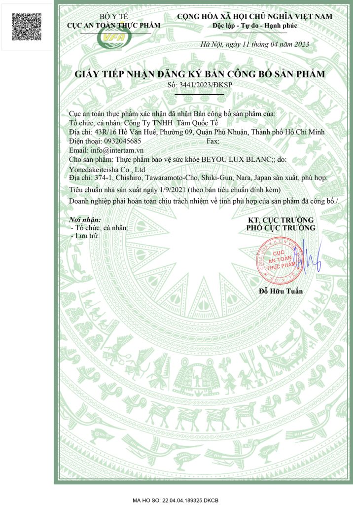Sản phẩm Beyou Lux Blanc đã được cấp giấy chứng nhận chất lượng sản phẩm của Bộ Y tế Việt Nam phù hợp với các quy định về chất lượng, bảo đảm vệ sinh an toàn.