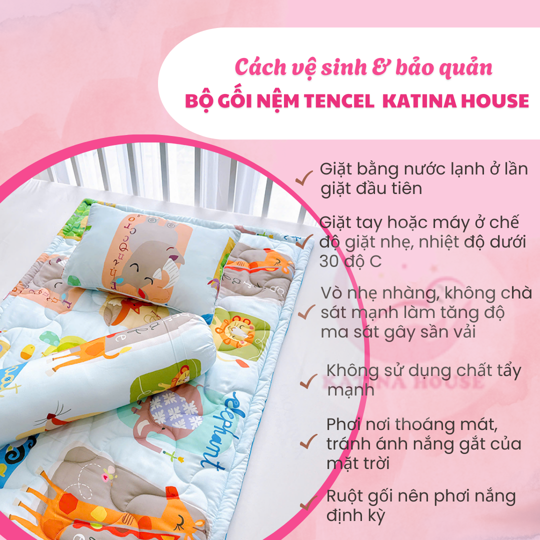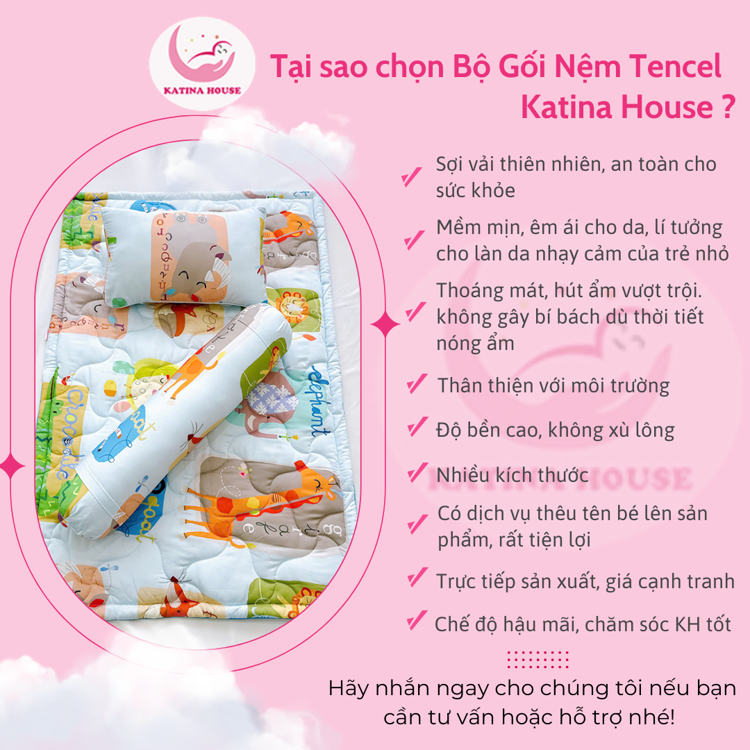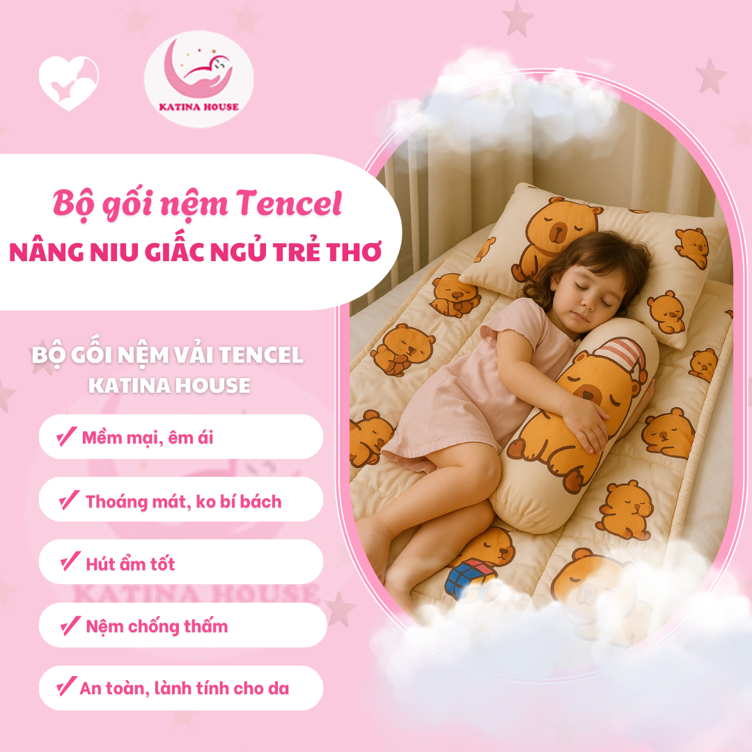 Bộ gối nệm cho bé đi học mầm non, tiểu học Katina House, vải Tencel siêu mềm, thoáng mát