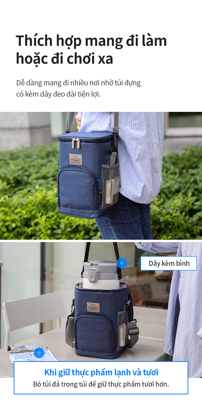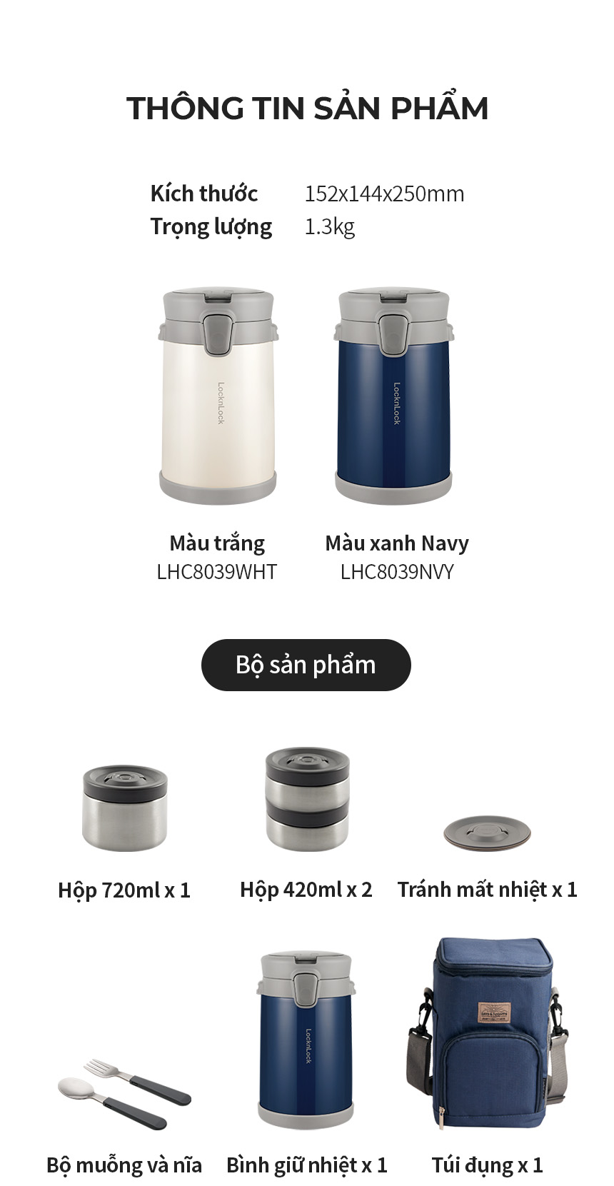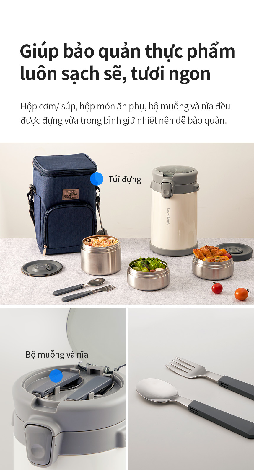 Sản phẩm gồm 3 phần chính: Túi đựng, bình lớn giữ nhiệt, 3 hộp đựng thức ăn (đi kèm bộ muỗng và nĩa)