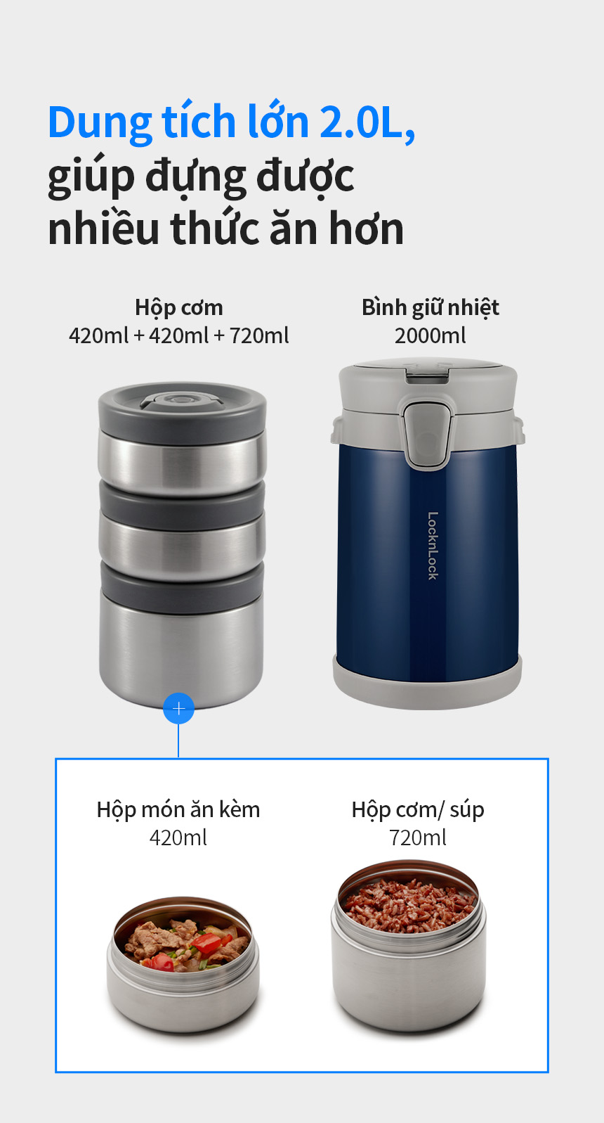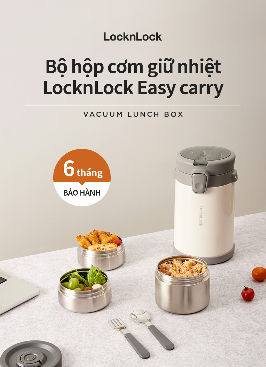 Bộ Hộp Cơm Giữ Nhiệt Lock&Lock Easy Carry 2L màu trắng LHC8039WHT Có Túi (1 Hộp 720ml, 2 Hộp 420ml Kèm 1 Bộ Muỗng Và Nĩa), Hàng chính hãng - JoyMall