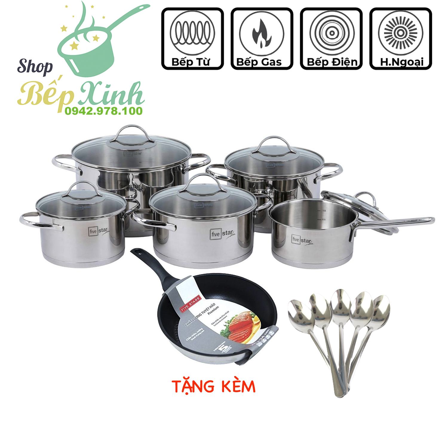 Combo Bộ nồi inox 304 và chảo chống dính cao cấp Fivestar 6 món nắp kính , 3 đáy dùng được bếp từ , hồng ngoại , gas, tặng 10 muỗng ăn