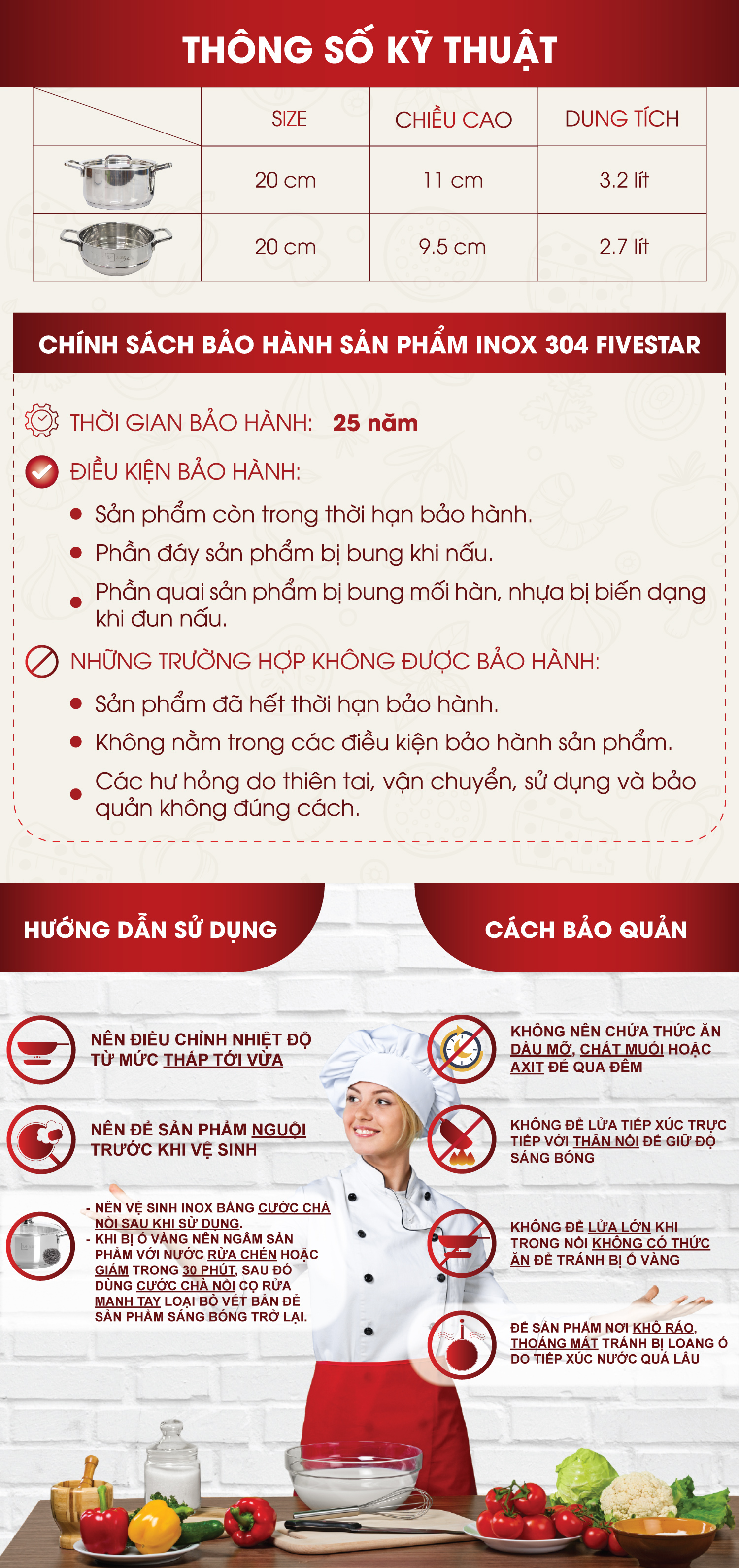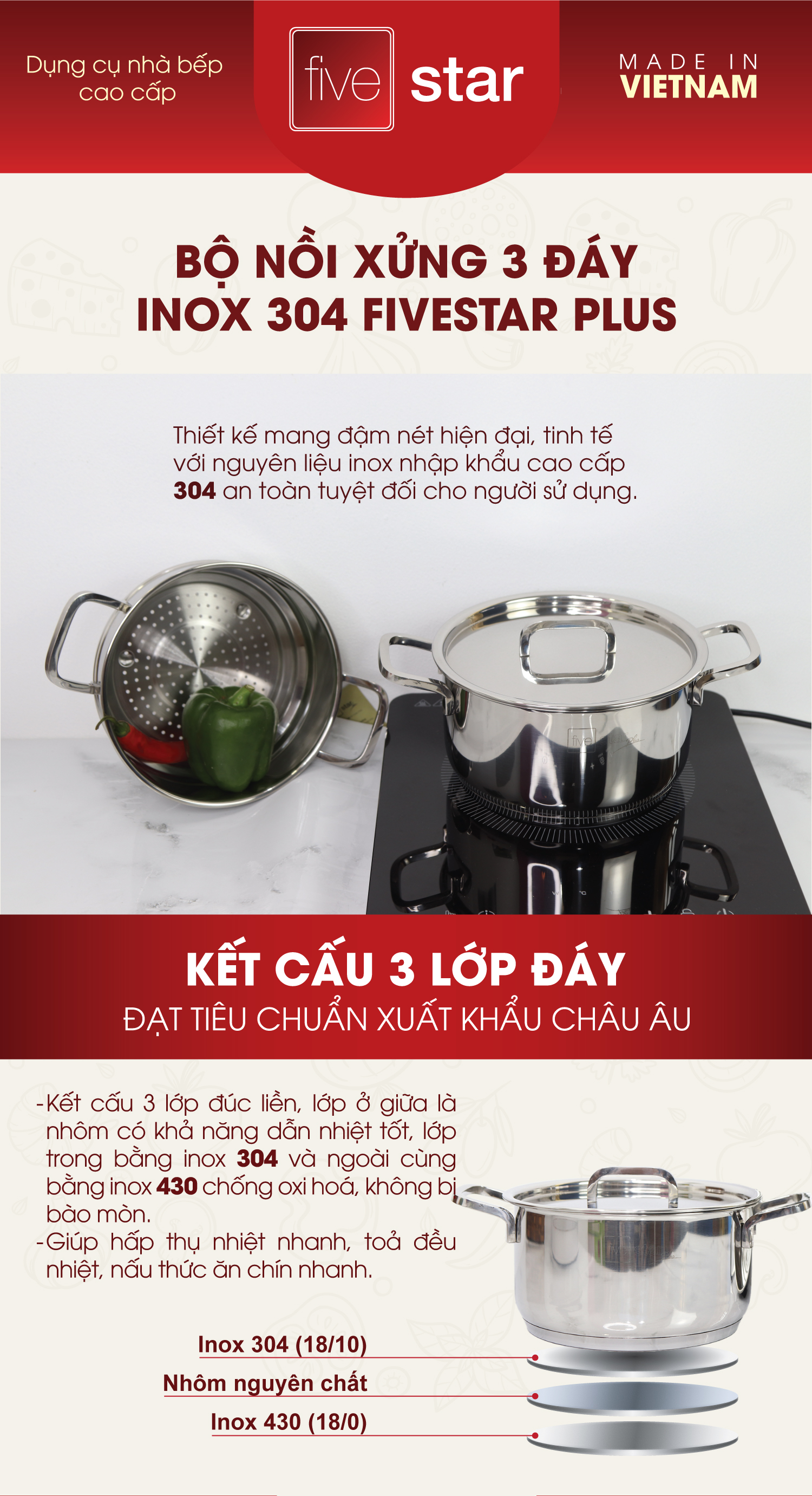 Bộ nồi xửng hấp inox 304 Fivestar Plush 3 đáy bếp từ nắp inox ( 20cm )