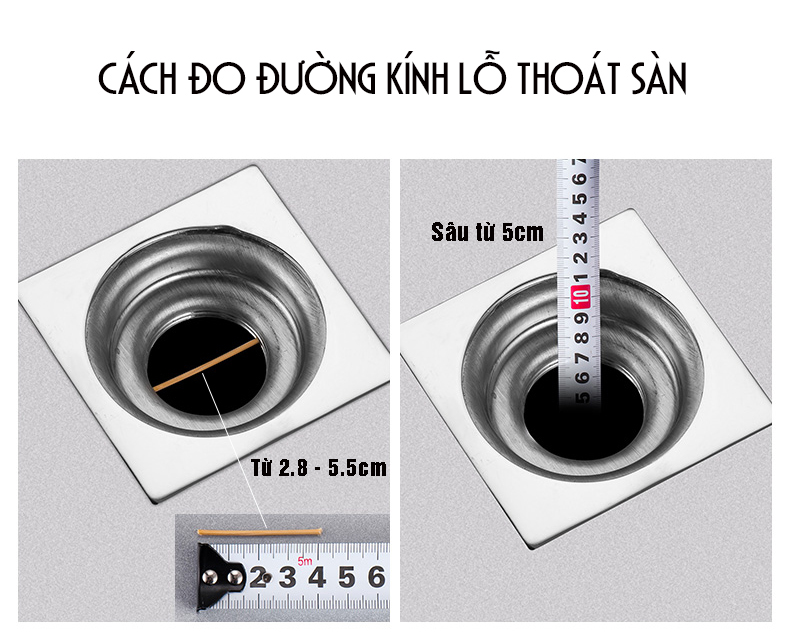 Bộ thoát nước máy giặt, thoát nước thải phù hợp với lỗ thoát sàn có đường kính lỗ: Từ 28mm – 55mm (vừa hết các lỗ thoát sàn thông dụng hiện nay)