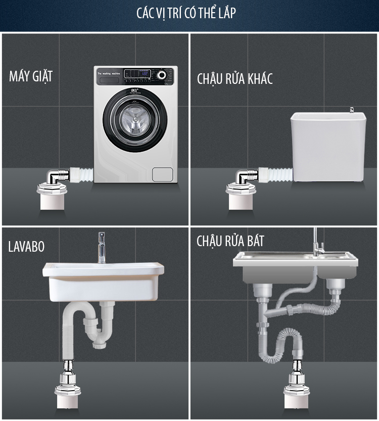 Vị trí lắp: bộ thoát nước máy giặt, thoát nước thải kiêm chống mùi hôi trào ngược được Lắp vào thoát sàn có sẵn nơi đặt ống xả thải máy giặt, nơi thoát nước thải ống điều hòa, nơi thoát nước khác