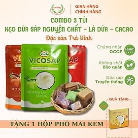 Combo 3 Kẹo dừa sáp VICOSAP vị cacao lá dứa kẹo mềm dẻo ít đường đặc sản Trà Vinh túi 100g