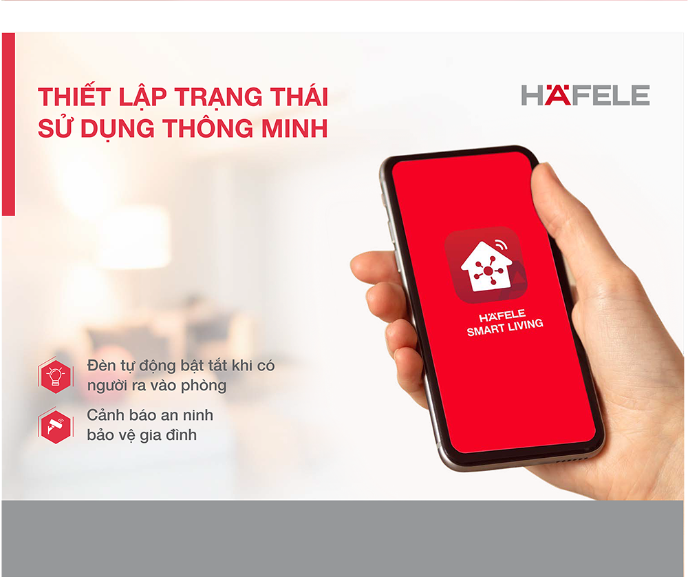 - Phát hiện chuyển động sẽ tự động mở đèn (Chọn: Cảm biến chuyển động HSL-MS01 + Hafele Gateway HSL-GW01 + Công tắc đèn thông minh Hafele Smart Switches)