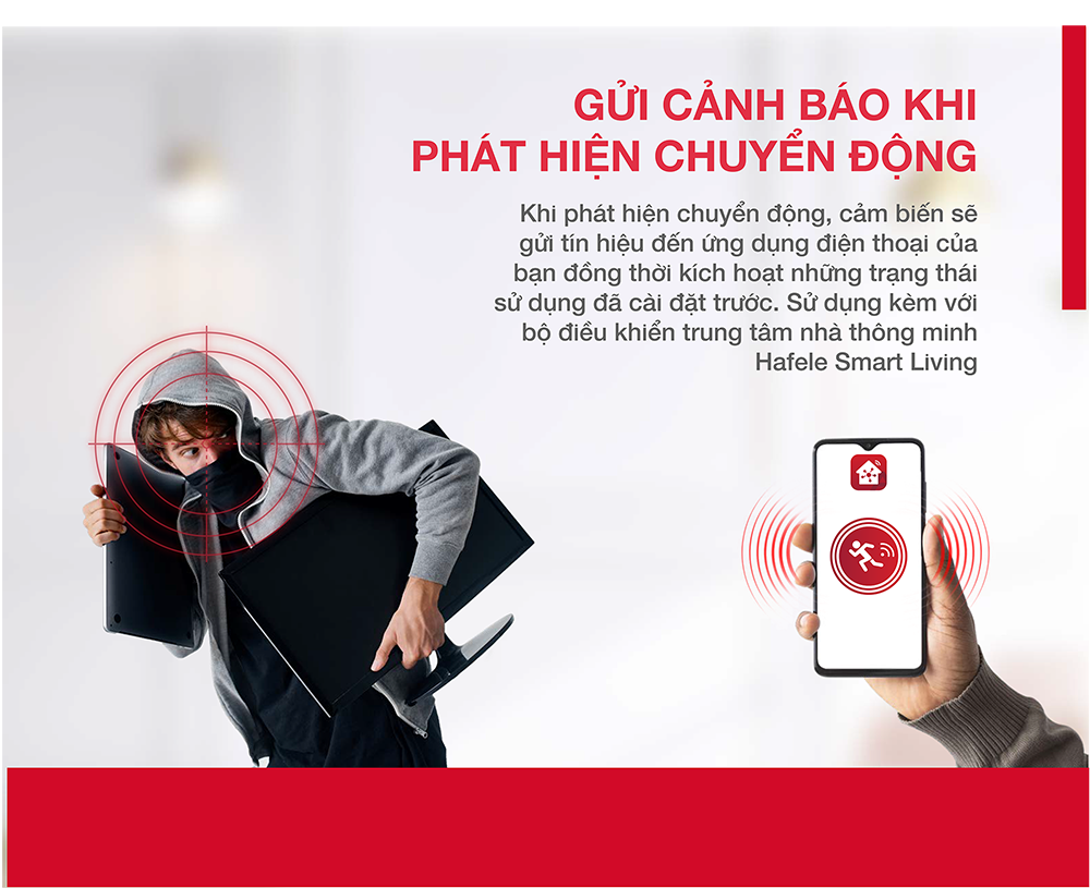 Có thể cài đặt nhận cảnh báo qua ứng dụng Häfele Smart Living khi cảm biến phát hiện có người đột nhập lúc vắng nhà.