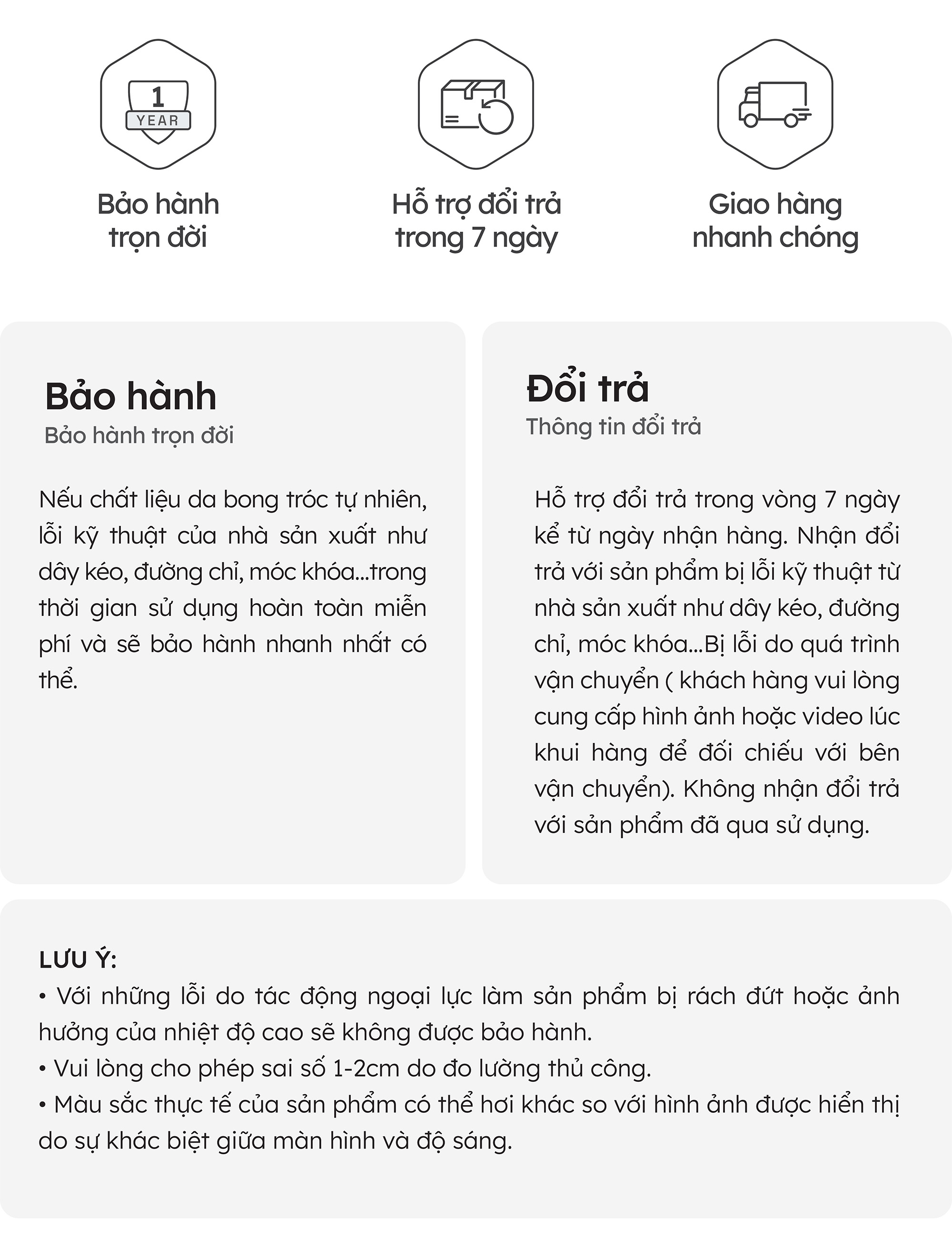 - Nhận đổi trả với sản phẩm bị lỗi kỹ thuật từ nhà sản xuất như dây kéo, đường chỉ, móc khóa…