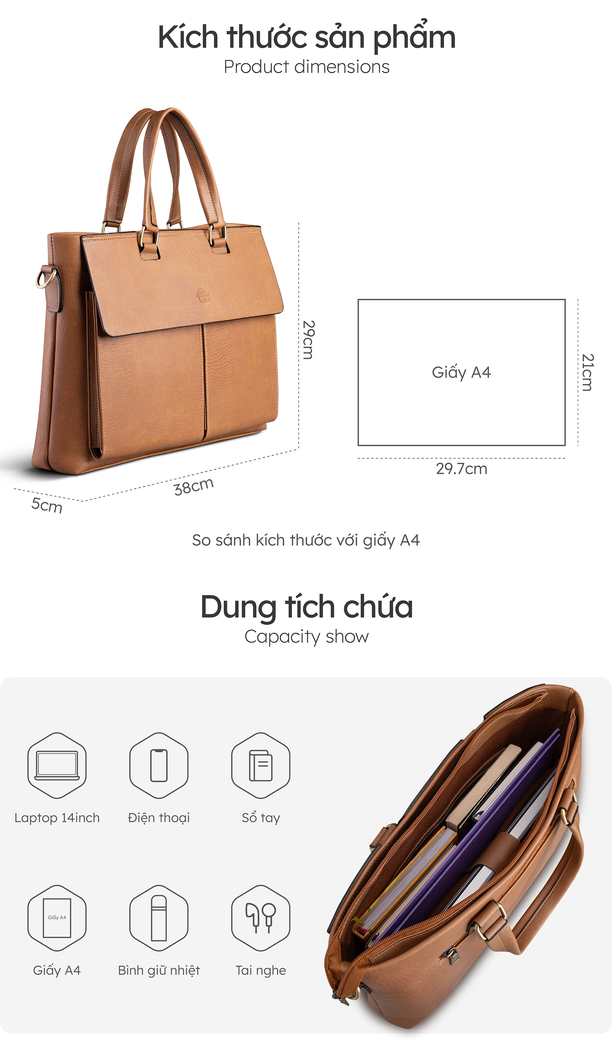 - Công dụng: Đựng laptop 14inch, giấy A4, vật dụng cần thiết khác,