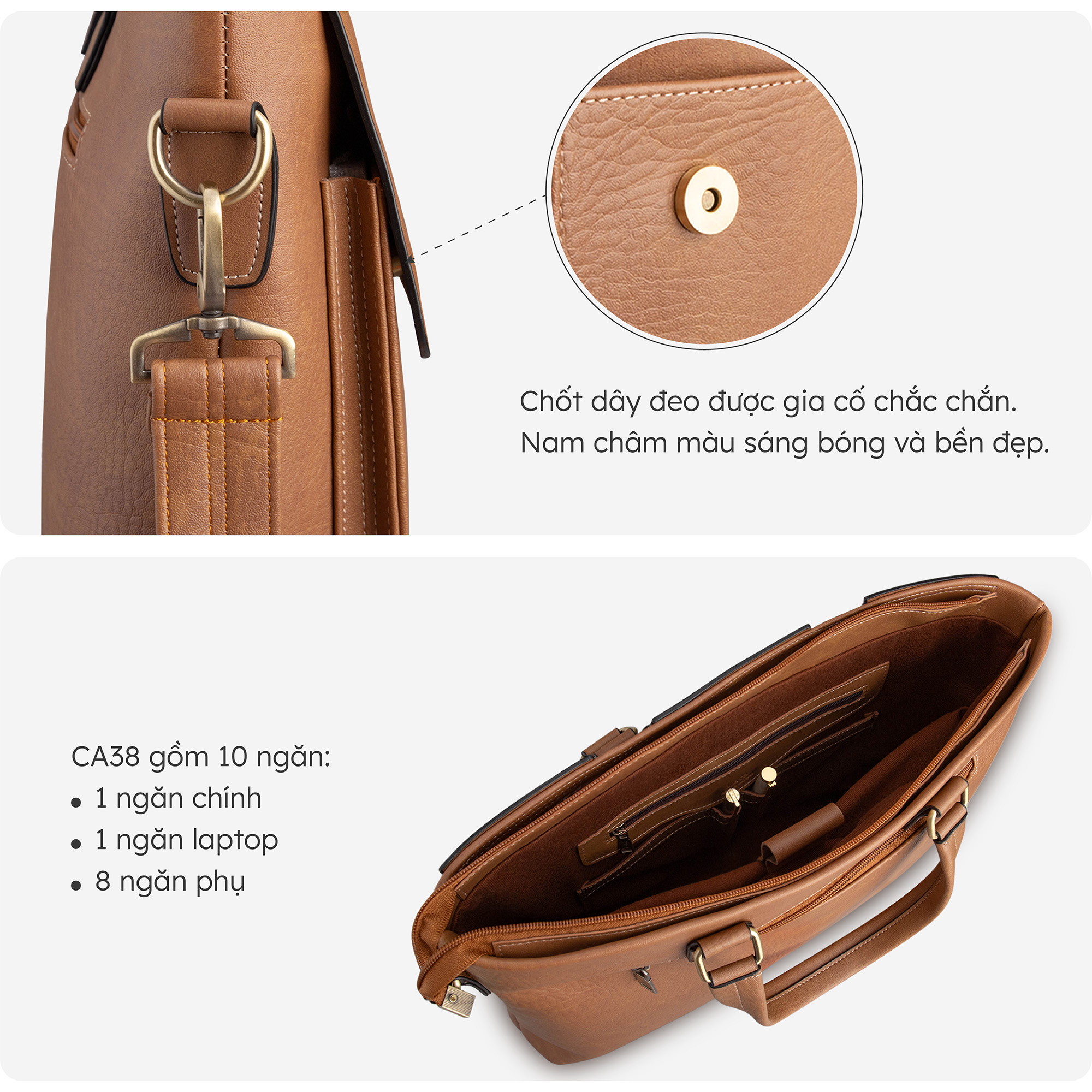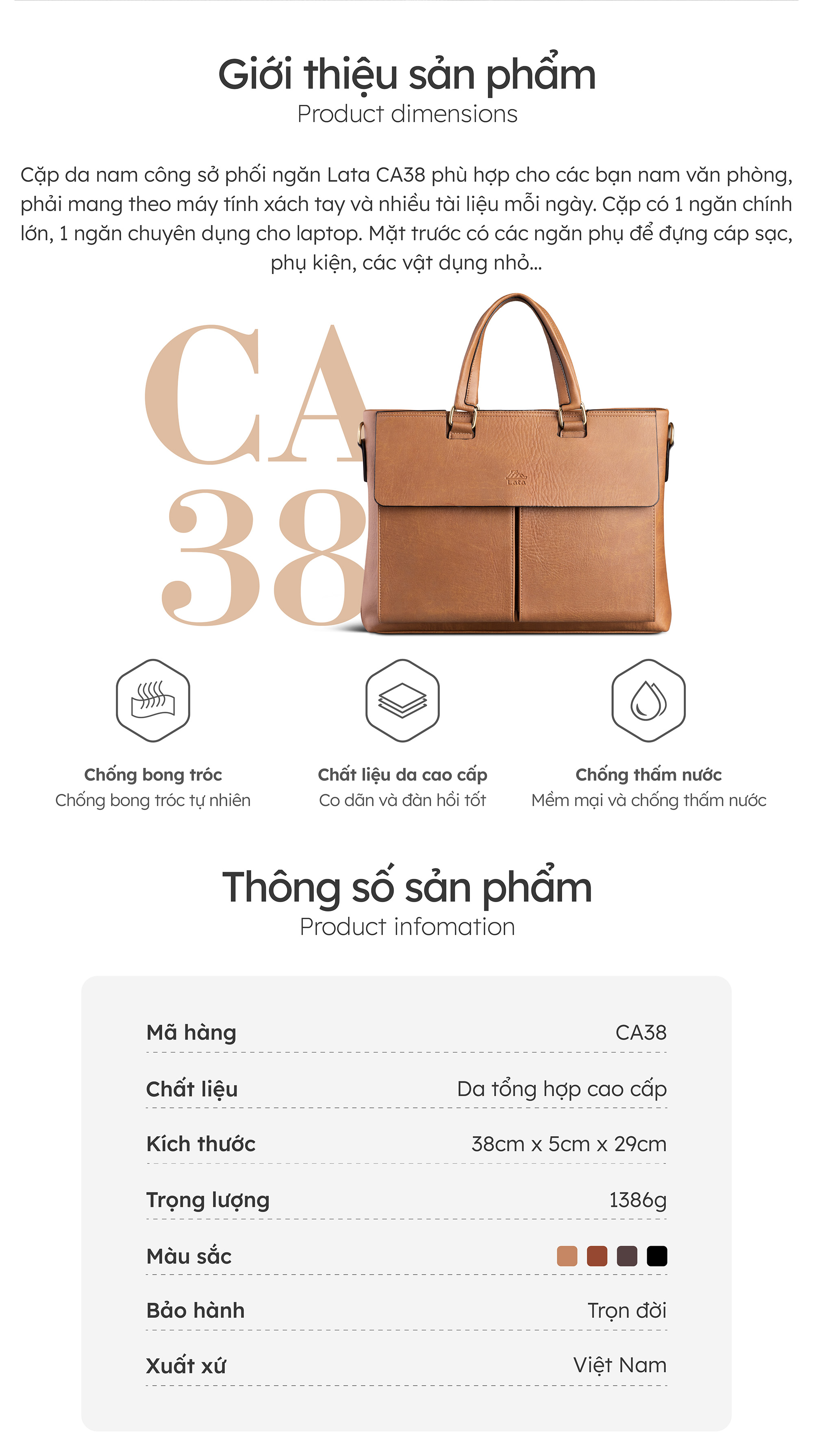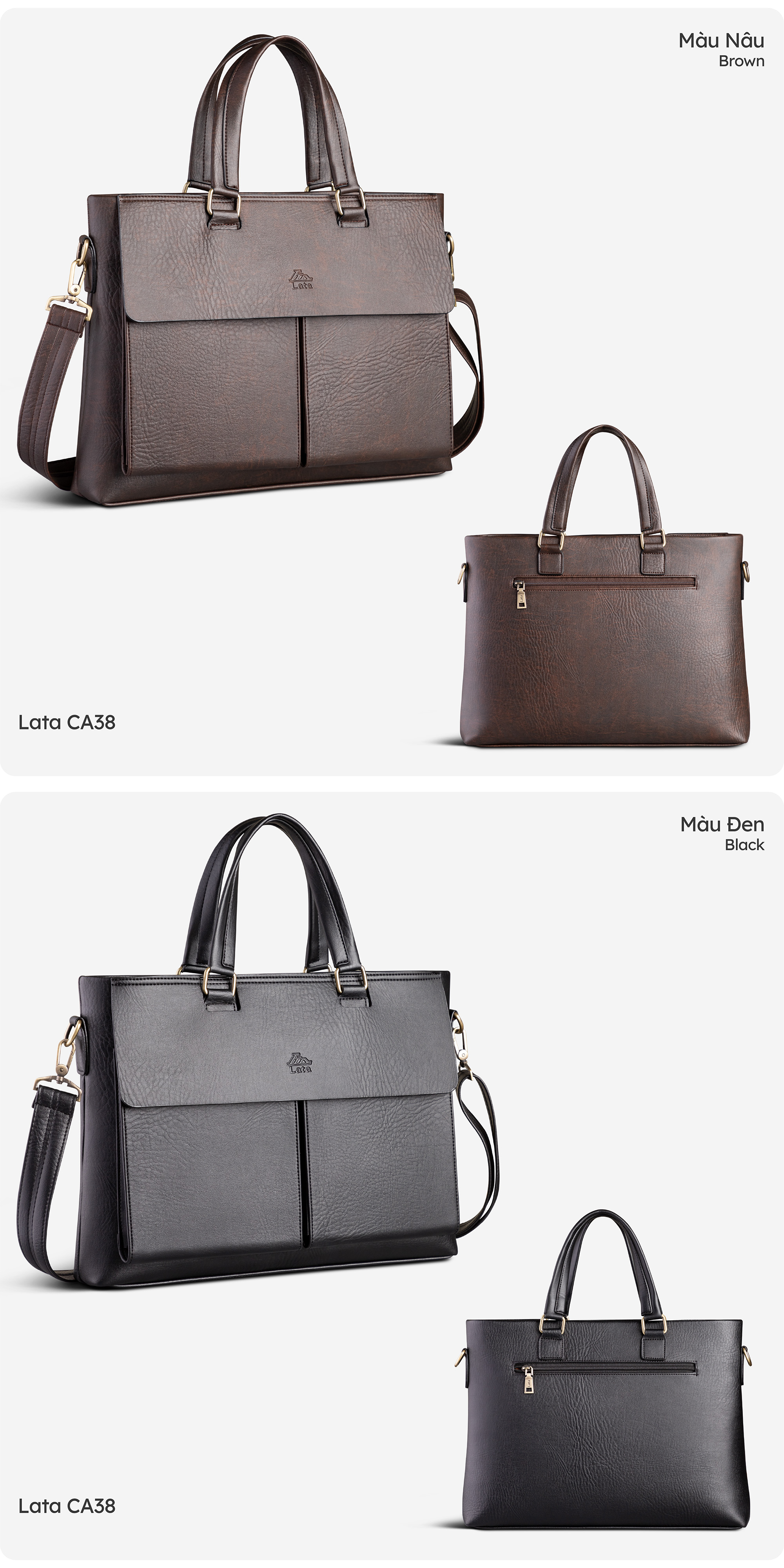 Cặp da nam công sở phối ngăn Lata CA38 phù hợp cho các bạn nam văn phòng, phải mang theo máy tính xách tay và nhiều tài liệu mỗi ngày. Cặp có 1 ngăn chính lớn, 1 ngăn chuyên dụng cho laptop. Mặt trước có các ngăn phụ để đựng cáp sạc, phụ kiện, các vật dụng nhỏ… Sản phẩm làm từ chất liệu da tổng hợp cao cấp, chống thấm nước, chống mốc, không bị nổ da hay bong tróc tự nhiên trong suốt quá trình sử dụng. Chiếc cặp đi kèm với dây đeo để bạn có thể dễ dàng thay đổi phong cách, xách tay hoặc đeo vai vô cùng tiện lợi.