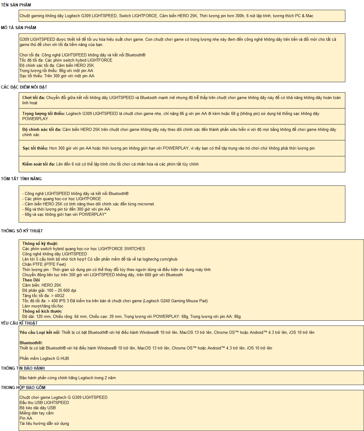 | Chuột gaming không dây Logitech G309 LIGHTSPEED, Switch LIGHTFORCE, Cảm biến HERO 25K, Thời lượng pin hơn 300h, 6 nút lập trình, tương thích PC & Mac | ||||||||||||
