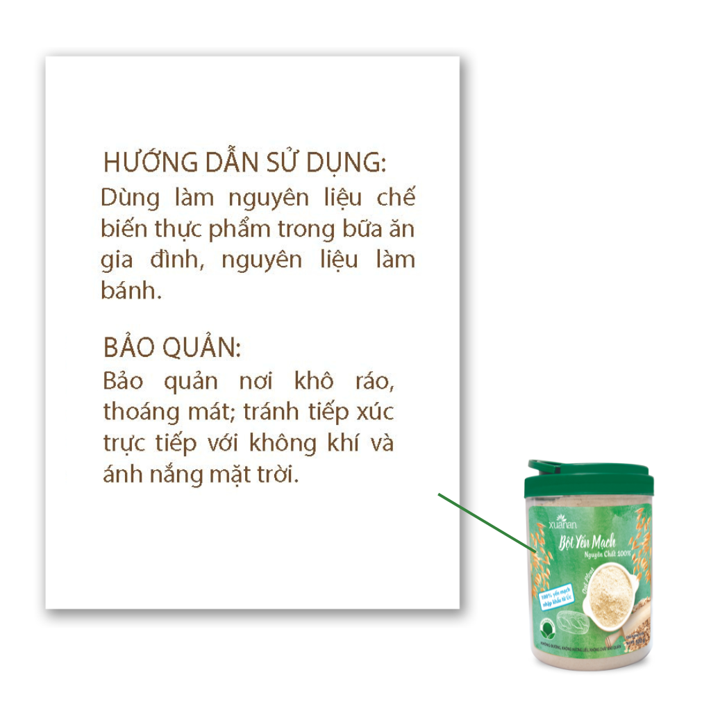 Thành phần : 100% Yến mạch nguyên cám nguyên chất. Không chất bảo quản, không hương liệu, không phụ gia.